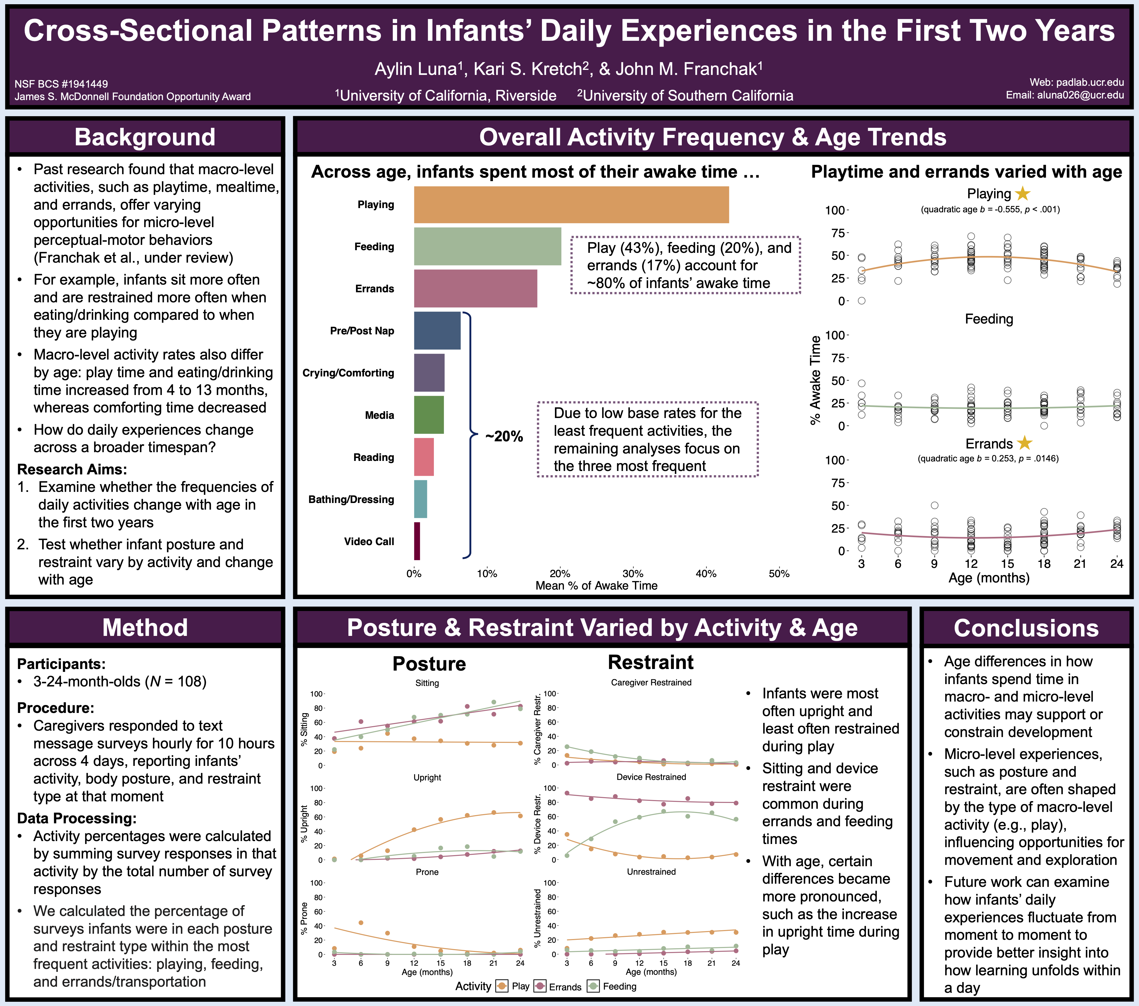 Aylin Luna presented a poster, “Cross-Sectional Patterns in Infants’ Daily Experiences in the First Two Years”, with Prof. Kari Kretch (USC) and Prof. John Franchak as co-authors.