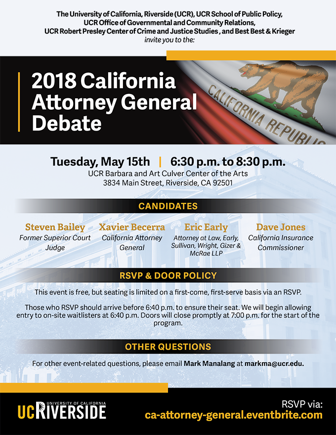 Hosted by the University of California, Riverside (UCR), UCR School of Public Policy, UCR Office of Governmental and Community Relations, UCR Robert Presley Center of Crime & Justice Studies, and Best Best & Krieger