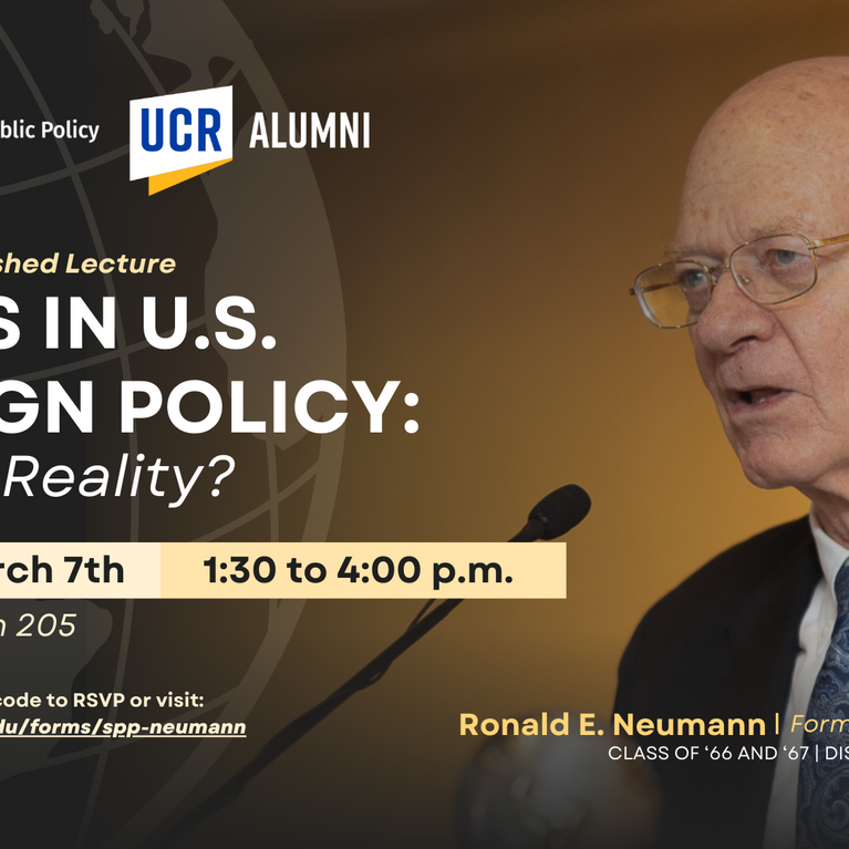 Former Ambassador Speaks on Foreign Policy Under Trump Administration by Divya Bharadwaj The UC Riverside School of Public Policy is hosting former U.S. Ambassador Ronald E. Neumann (Class of '66 and ‘67 and recipient of the Distinguished Alumni Award) for the inaugural talk of its Distinguished Lecture Series on the evolving landscape of foreign policy...