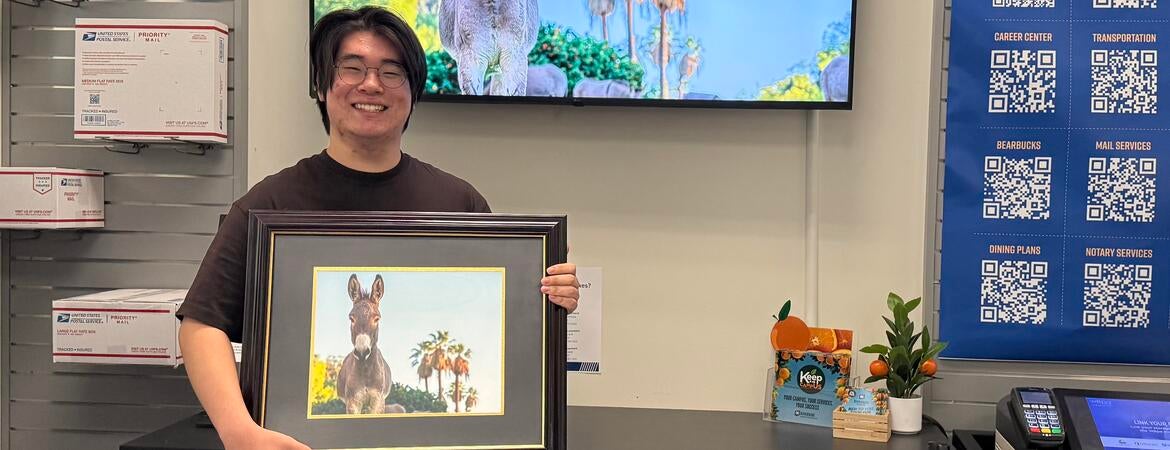 UC Riverside first-year business student Dennis Cha was selected as the winner of the 2025 R’Card photo contest on March 12. His winning image, which features a burro in front of palm trees under a blue sky, will be printed on thousands of new R’Cards distributed to students, staff, and faculty for the 2025-26 academic year.