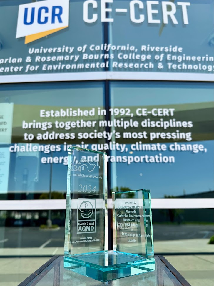 CE-CERT proudly accepted the Leadership in Air Quality Award at the 34th Annual Clean Air Awards, presented by the South Coast Air Quality Management District (South Coast AQMD). The award recognizes CE-CERT's three decades of contributions toward reducing pollution and improving air quality.
