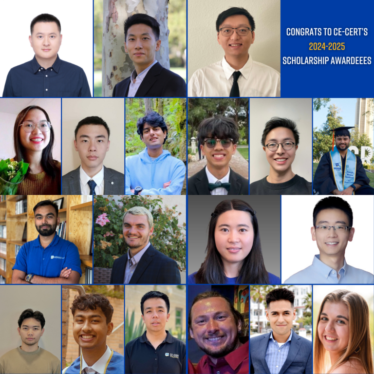 The Center for Environmental Research and Technology (CE-CERT) solicits applications for various scholarships once a year. These awards are open to current undergraduates and to current and prospective graduate students who are or plan to be affiliated with CE-CERT.  Current students must be in good academic standing with a GPA of 3.0 or higher. Prospective graduate students must have completed their UCR graduate application and must be expected to work primarily at CE-CERT if they come to UCR.  Other criteria vary by award; click on the links below for more information. Contact Don Collins at donc@ucr.edu with questions or for more information about these awards.