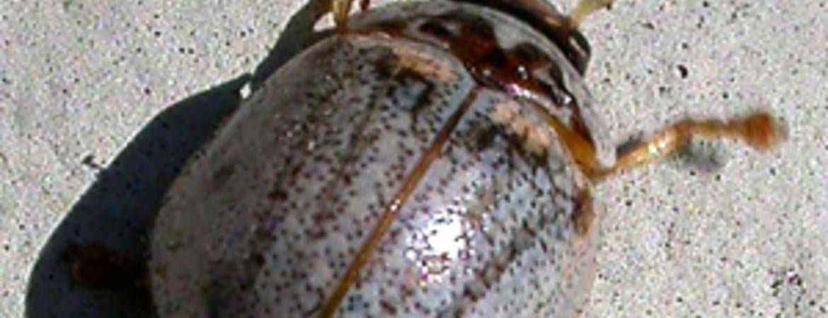 Identification: Both beetle species are similar in size, about the size of a ladybug. Eucalyptus leaf beetle adults are gray to reddish brown and the larvae are greenish-gray. The Australian tortoise beetle adult and larvae are both dark brown.