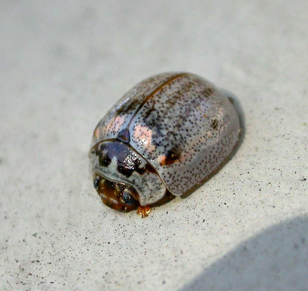 Identification: Both beetle species, C. m-fuscum and T. sloanei, are similar in size, about the size of a big ladybug. Eucalyptus leaf beetle adults are gray to reddish brown and the larvae are greenish-gray. The Australian tortoise beetle adult and larvae are both dark brown.