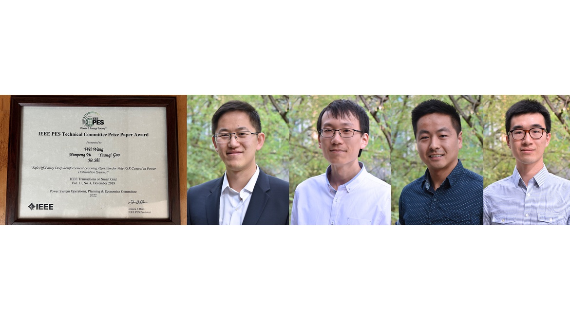 Nanpeng Yu, Associate Professor of Electrical and Computer Engineering, received the Technical Prize Paper Award from the Institute of Electrical and Electronics Engineers (IEEE) Power and Energy Society (PES). The Award Plaque, which is signed by the President of the IEEE PES Society, was presented to Prof. Nanpeng Yu and his Ph.D. students (Wei Wang, Yuanqi Gao, Jie Shi) for their highly influential journal paper “Safe Off-Policy Deep Reinforcement Learning Algorithm for Volt-VAR Control in Power Distribution Systems”. The journal paper was published in IEEEE Transactions on Smart Grid, which is the top venue in the power and energy field. This award was granted in July 2022 by the IEEE PES Society’s Technical Committee on Power System Operations, Planning & Economics through an annual selection process. Each year, one technical paper is selected to receive this award based on its theoretical innovation and broader impacts in electric power systems.