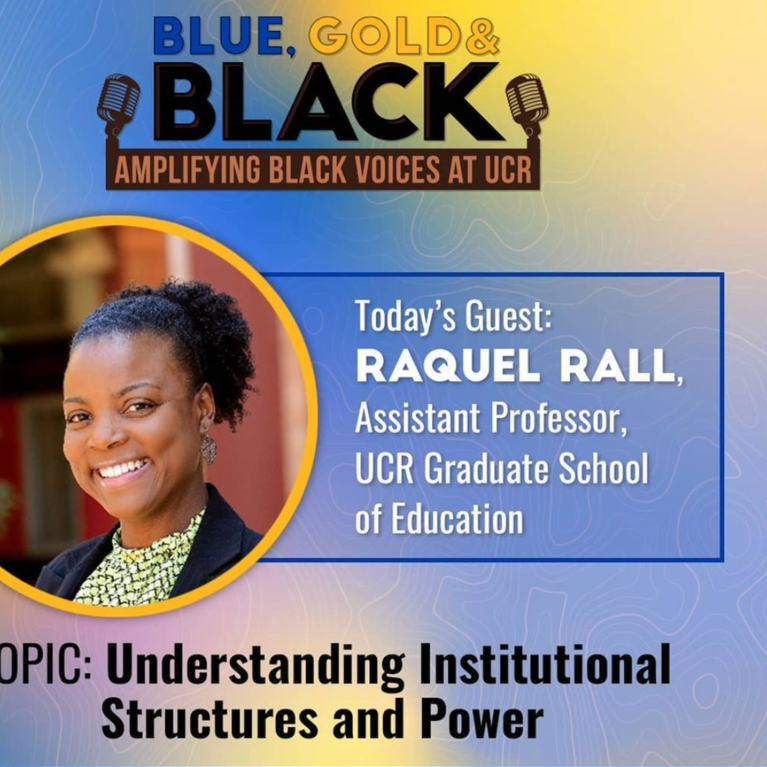 UCR’s Blue, Gold & BLACK (BGB) podcast brings students, campus leaders, and community partners together to explore the intersection of being Black and being a UCR Highlander. Listen as Dr. Rall shares her educational journey