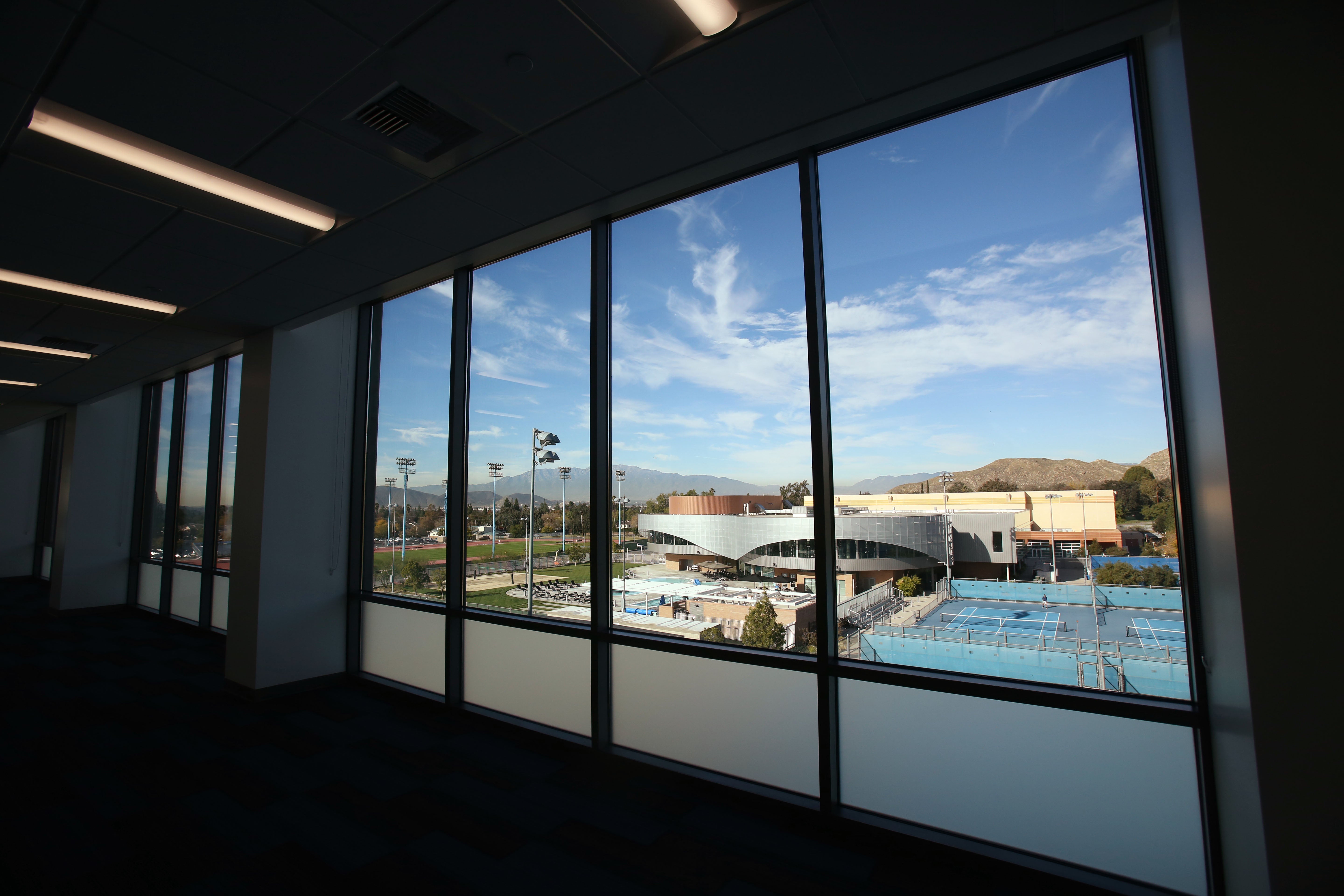 The building makes extensive use of natural light with a four-story atrium and skylight at the entrance and large windows with striking views of Mount Rubidoux and the Box Springs Mountains.