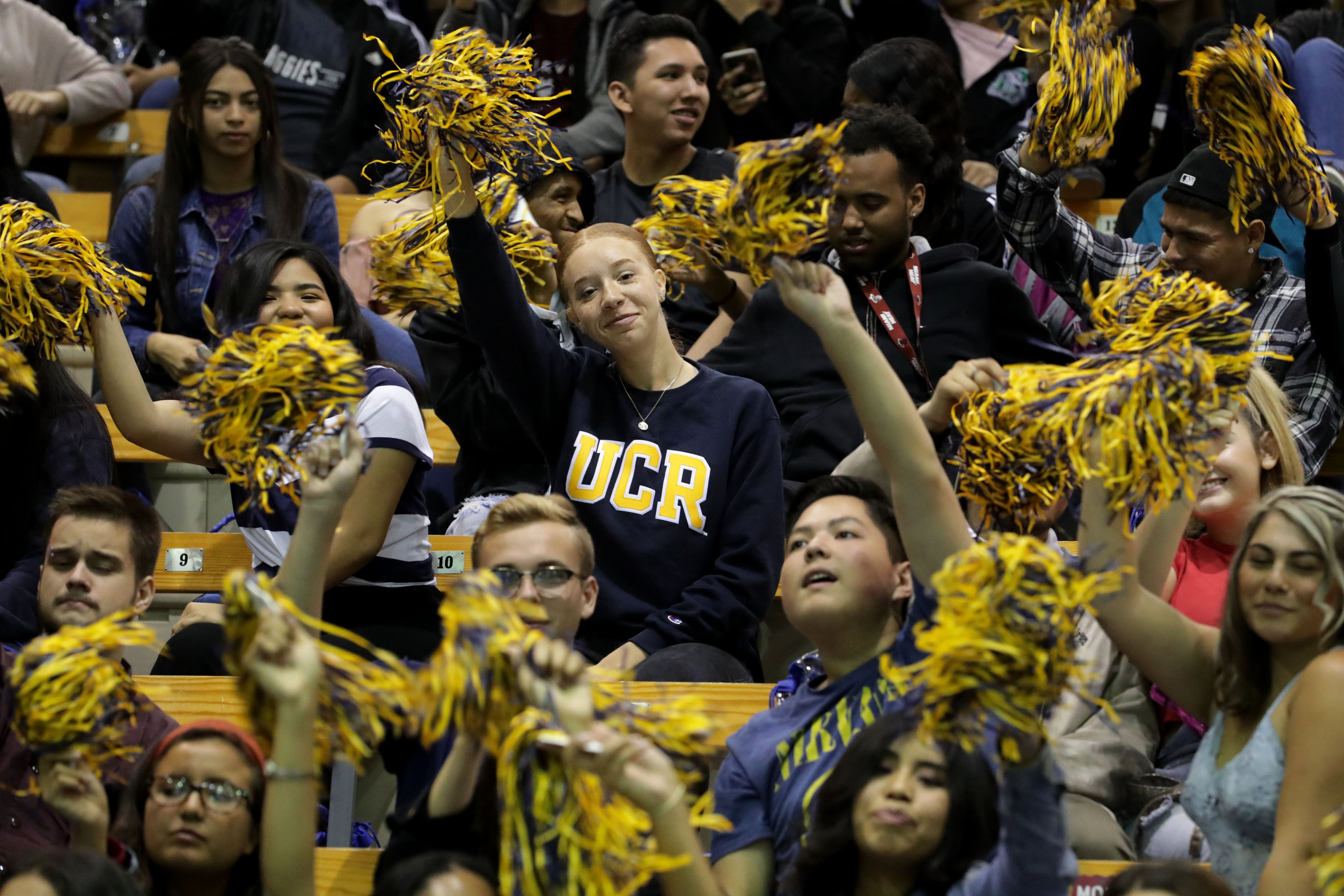 The students, who came from more than a dozen school districts in Riverside and San Bernardino counties, were greeted with boxed lunches and bags of swag that included pom-poms, a T-shirt, and hand sanitizer. They posed for photos in front of a backdrop of blue and gold balloons with some taking selfies with Scotty the Bear. As a DJ played music, several took to the dancefloor with Scotty joining them for some songs.