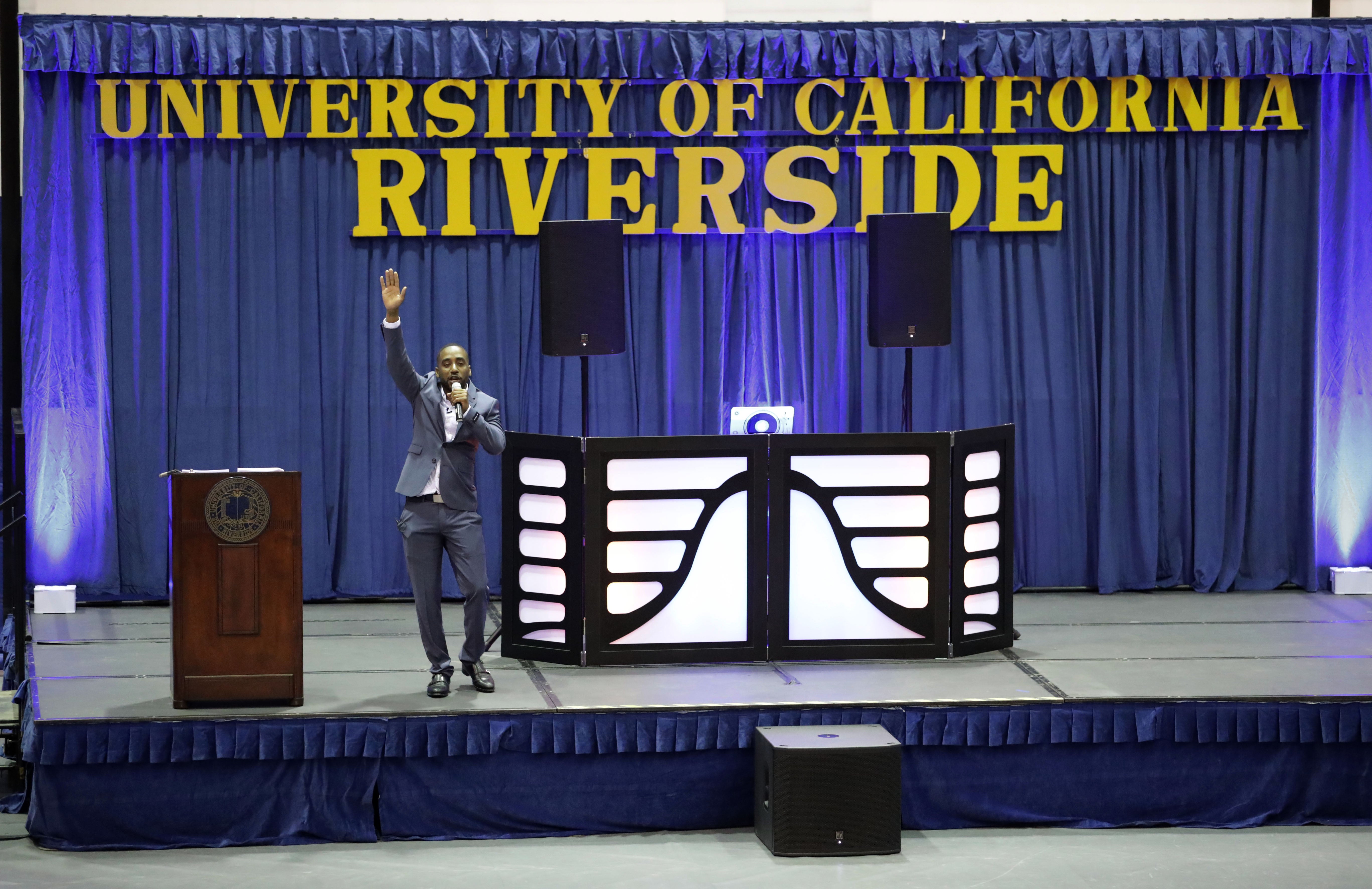 Artist and poet Nate Howard, UCR’s keynote speaker, led the students on a call-and-chant as he advised them not to be discouraged by detractors along the way.