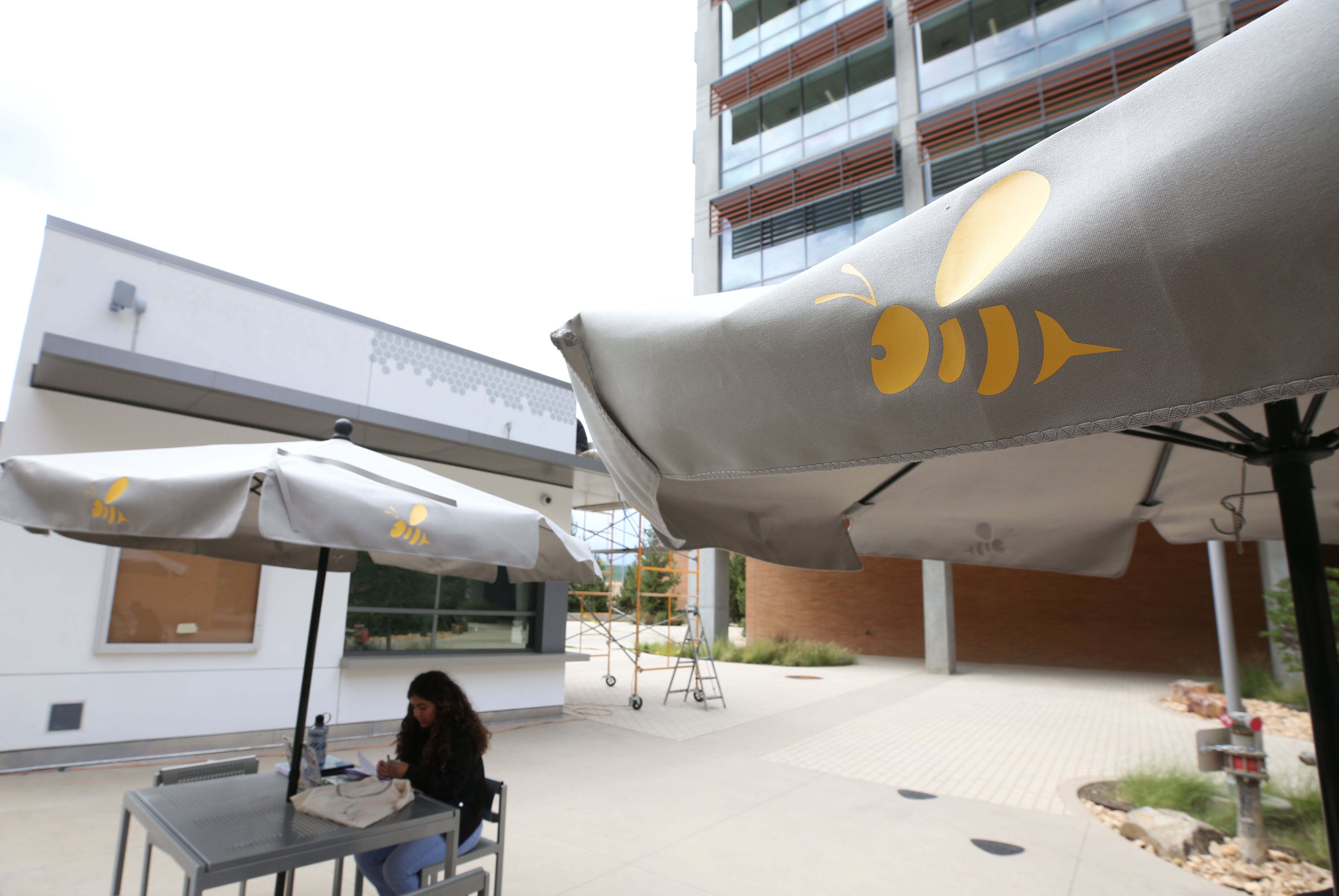 The bee motif is part of the look of the café which features honeycomb patterns, a yellow-and-black color scheme, and a yellow bee logo on the side of the building and on top of the umbrellas over the tables.