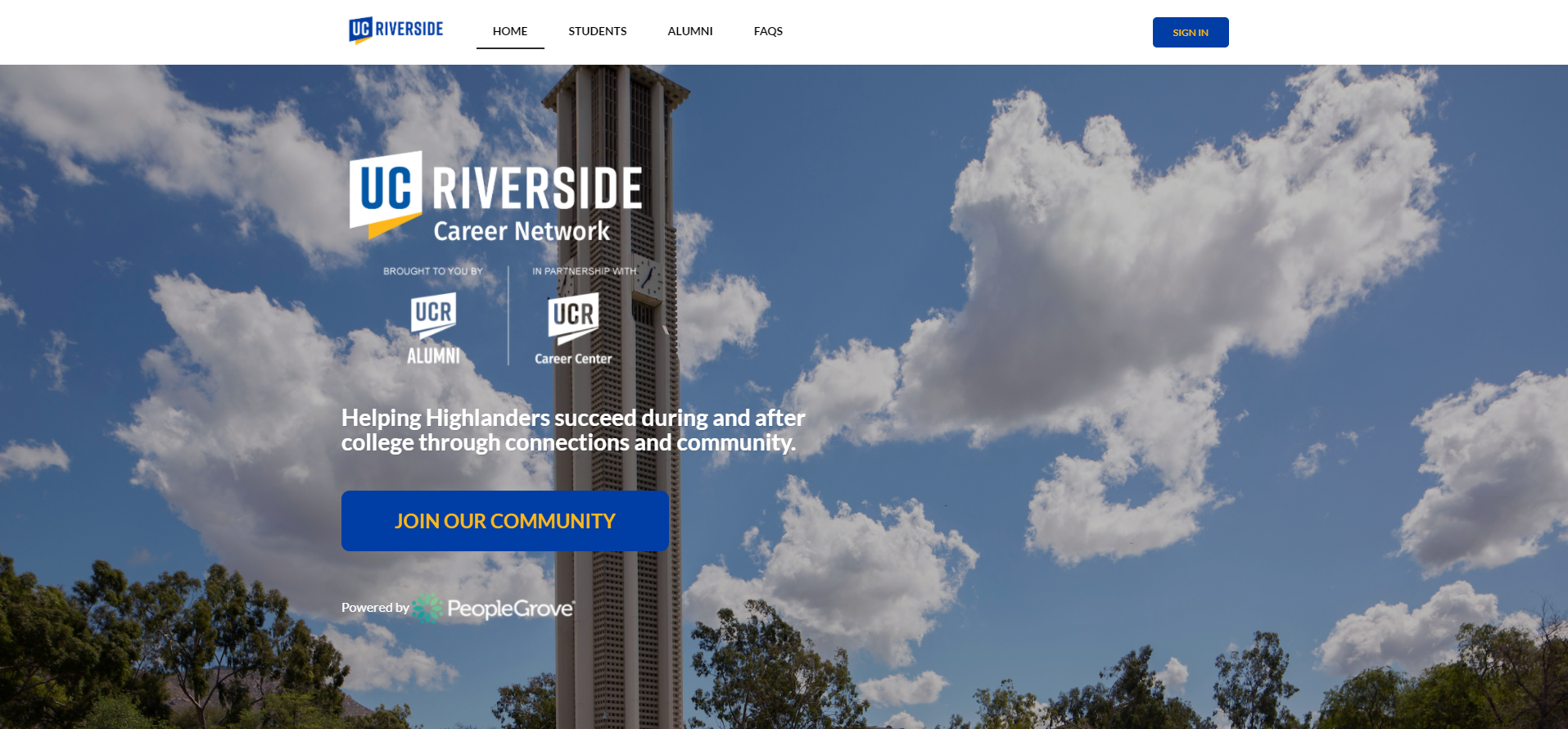 The UCR Career Network, launched this fall, is an online platform where students and alumni can search for profiles and network with those holding common career interests. The platform is powered by PeopleGrove, a software company that creates specialized career networking communities.
