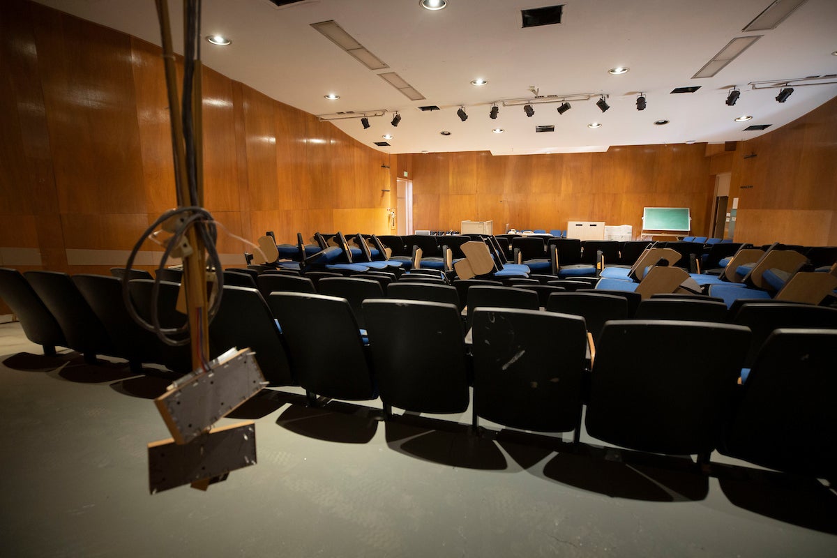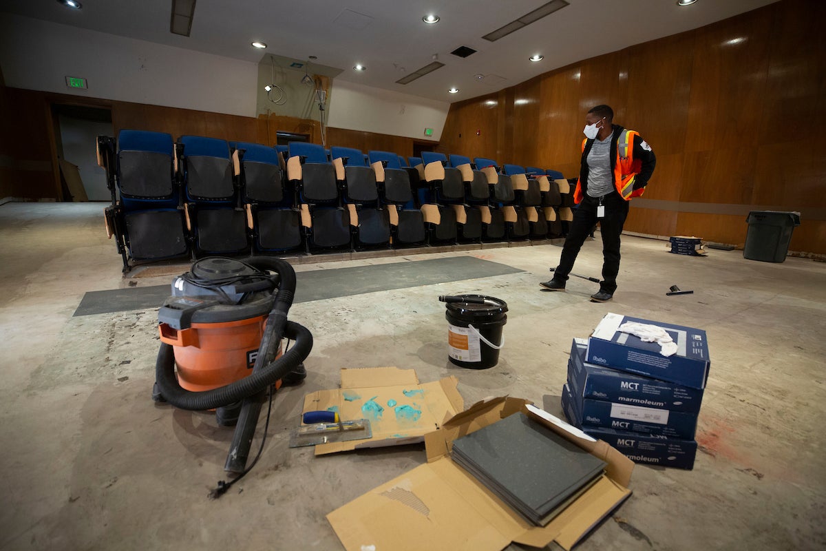 The renovations to the lecture hall, the largest room in the building, will improve accessibility by creating more aisle space for students who use wheelchairs. Companion seating and a chair lift for wheelchairs are also being added.