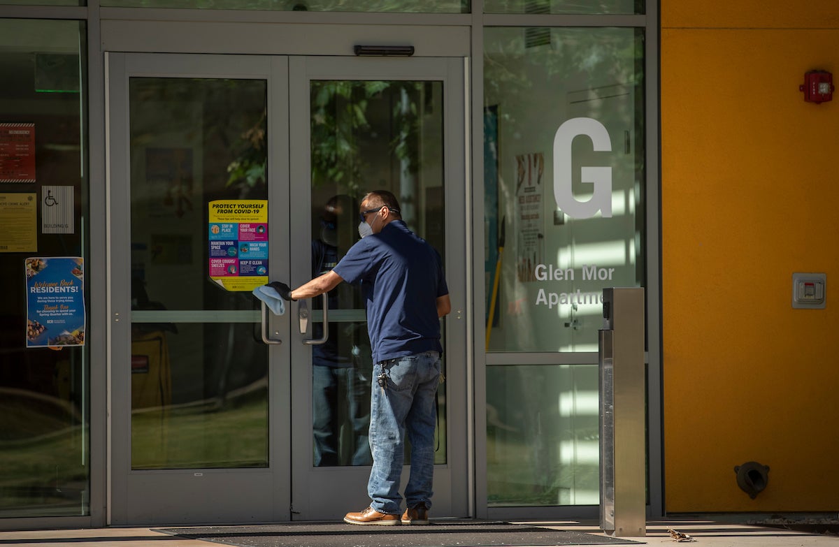 At the student residence halls, housekeeping personnel switched from a weekday-only schedule to a daily schedule so staff would be available 12 hours a day. Restroom cleaning increased from once per day to three times a day while electrostatic spraying of high-touch points and public areas is done at least twice a day. Disinfecting wipes are supplied to students in public areas so they can clean their spaces before and after use.