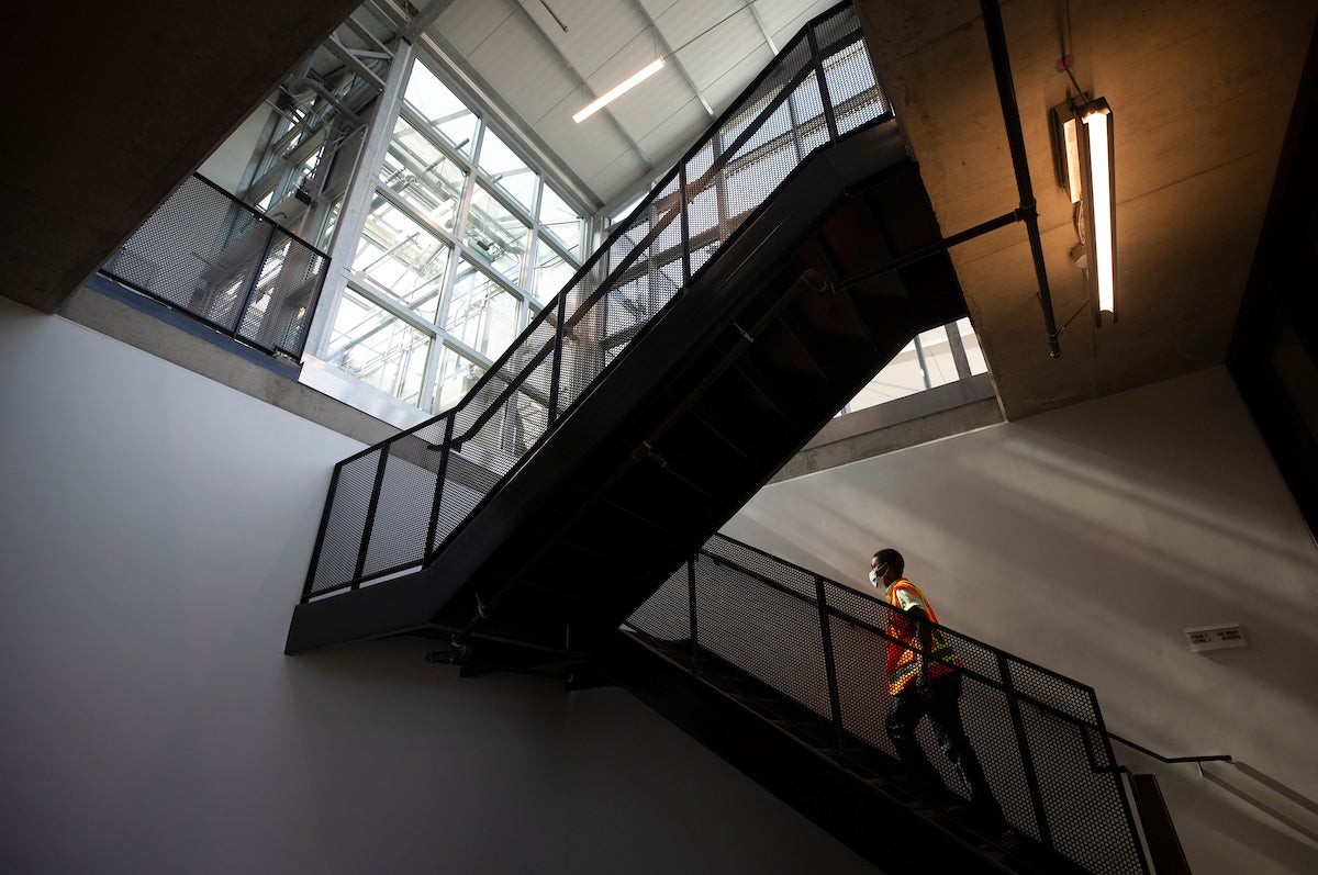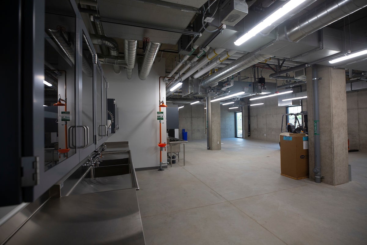 The second floor also includes work and clean lab space, allowing researchers to move easily from the modules to the lab when needed. Other features include an autoclave sterilizer for equipment, a cold storage room, and outdoor patios in the front and back of the building.