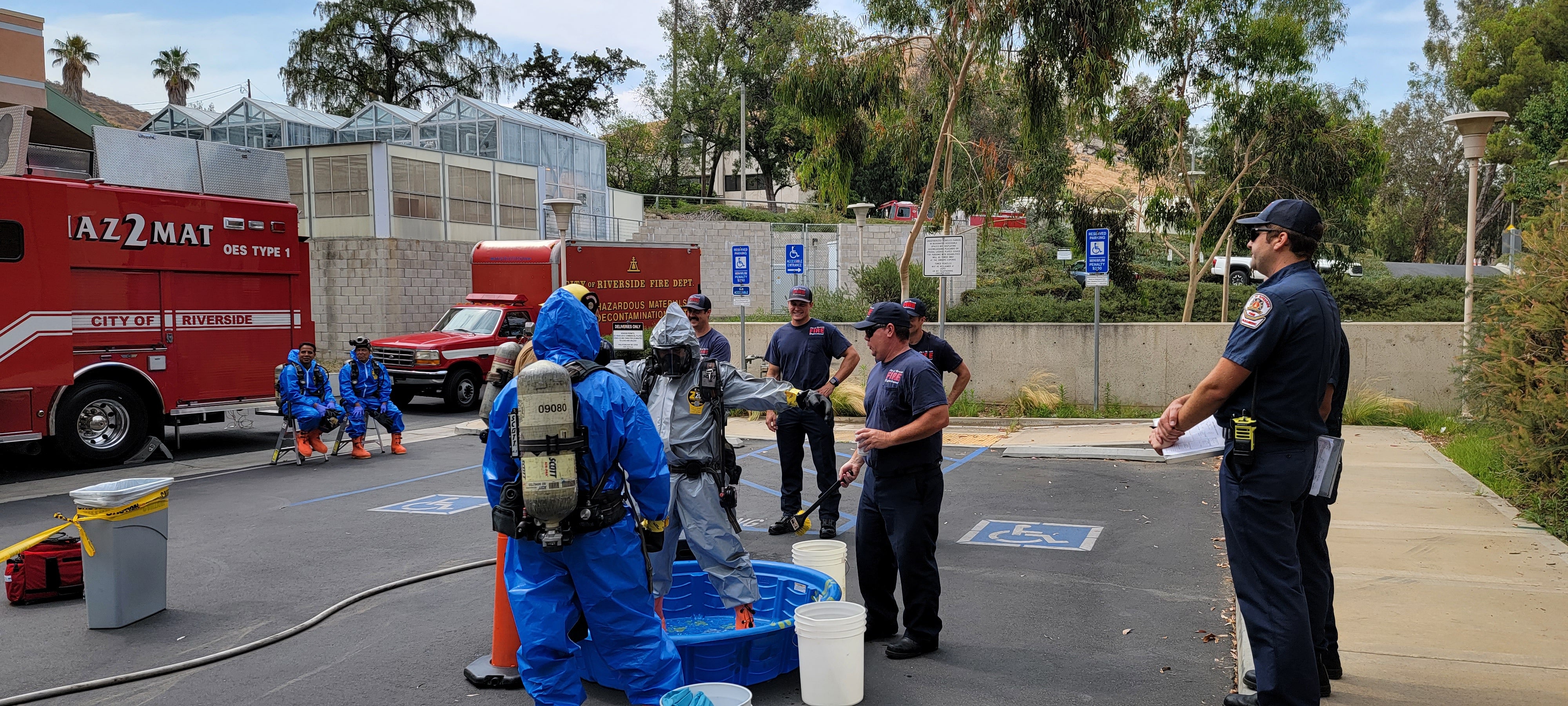 The June 29 drill included first responders from the Riverside Fire Department and Hazardous Materials team, who tested the response to an emergency at a biosafety level 3 lab. Also participating were UCR’s Environmental Health and Safety department, Fire Marshal, UC Riverside Police Department, and the Office of Emergency Management.