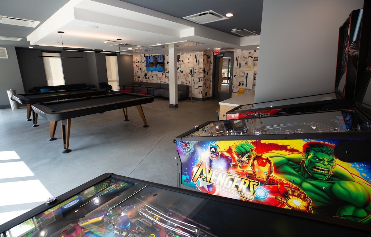 Student lounges include couches, televisions, and pool tables. A game room in one of the buildings features three pinball machines and pool tables. An outdoor shaded patio area features benches with nighttime lighting and ping pong and foosball tables.
