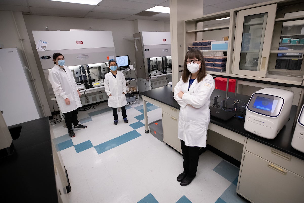 Lab manager Alexander Carrillo, left, lab technician Sophia Tsau, and Katherine Borkovich, Divisional Dean Life Sciences, at the COVID-19 testing lab in Webber Hall on Monday, September 27, 2021. (UCR/Stan Lim)