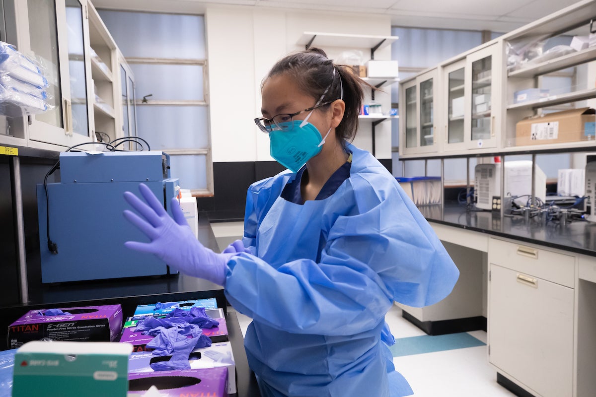 Lab technician Sophia Tsau, puts on gloves to begin preparing the COVID testing lab in Webber Hall before samples arrive on Monday, September 27, 2021. (UCR/Stan Lim)