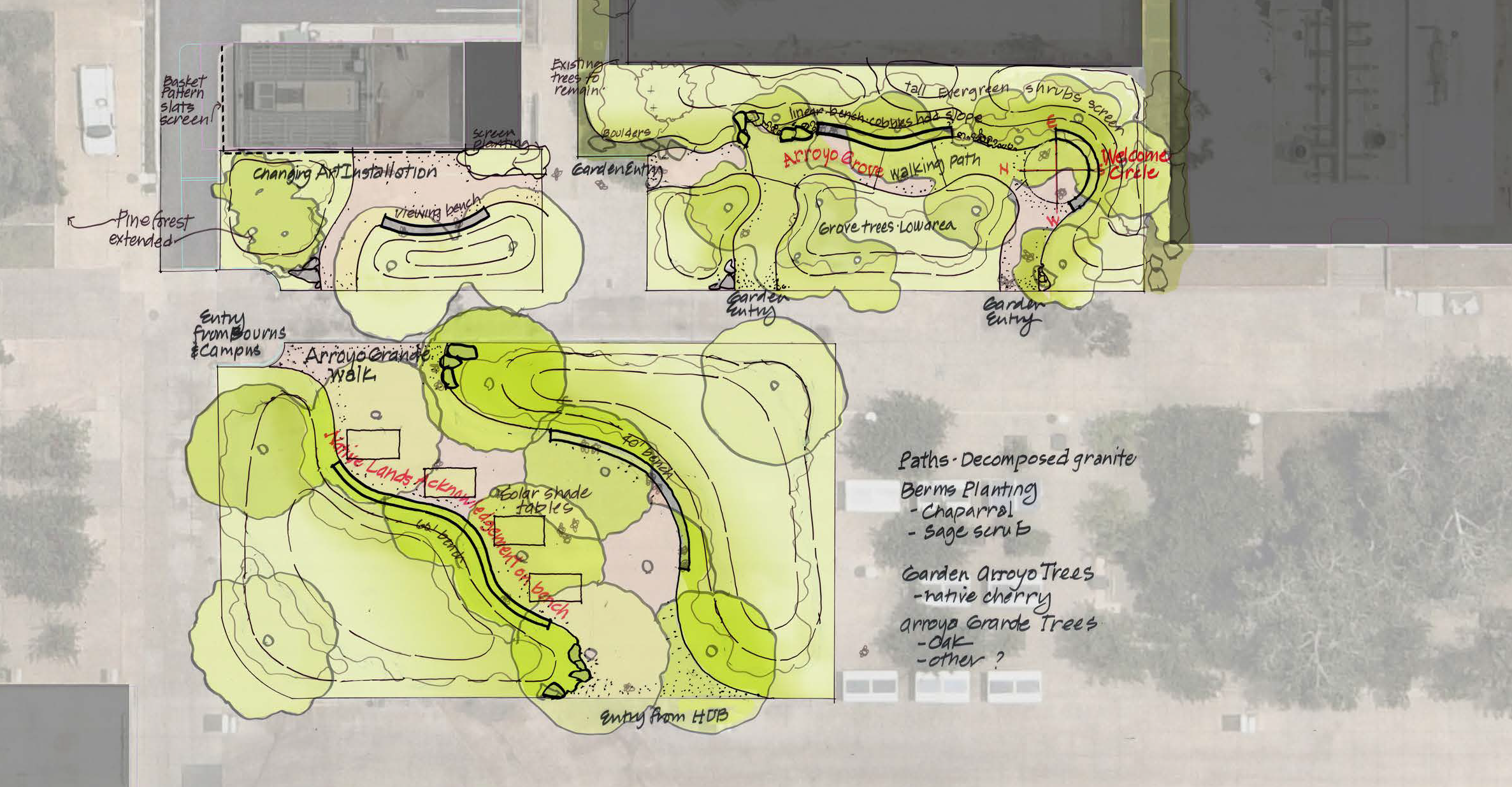 The concepts utilize a variety of plants and vegetation native to the different tribes and the region such as chapparal, oak, sage scrub, and desert vegetation.
