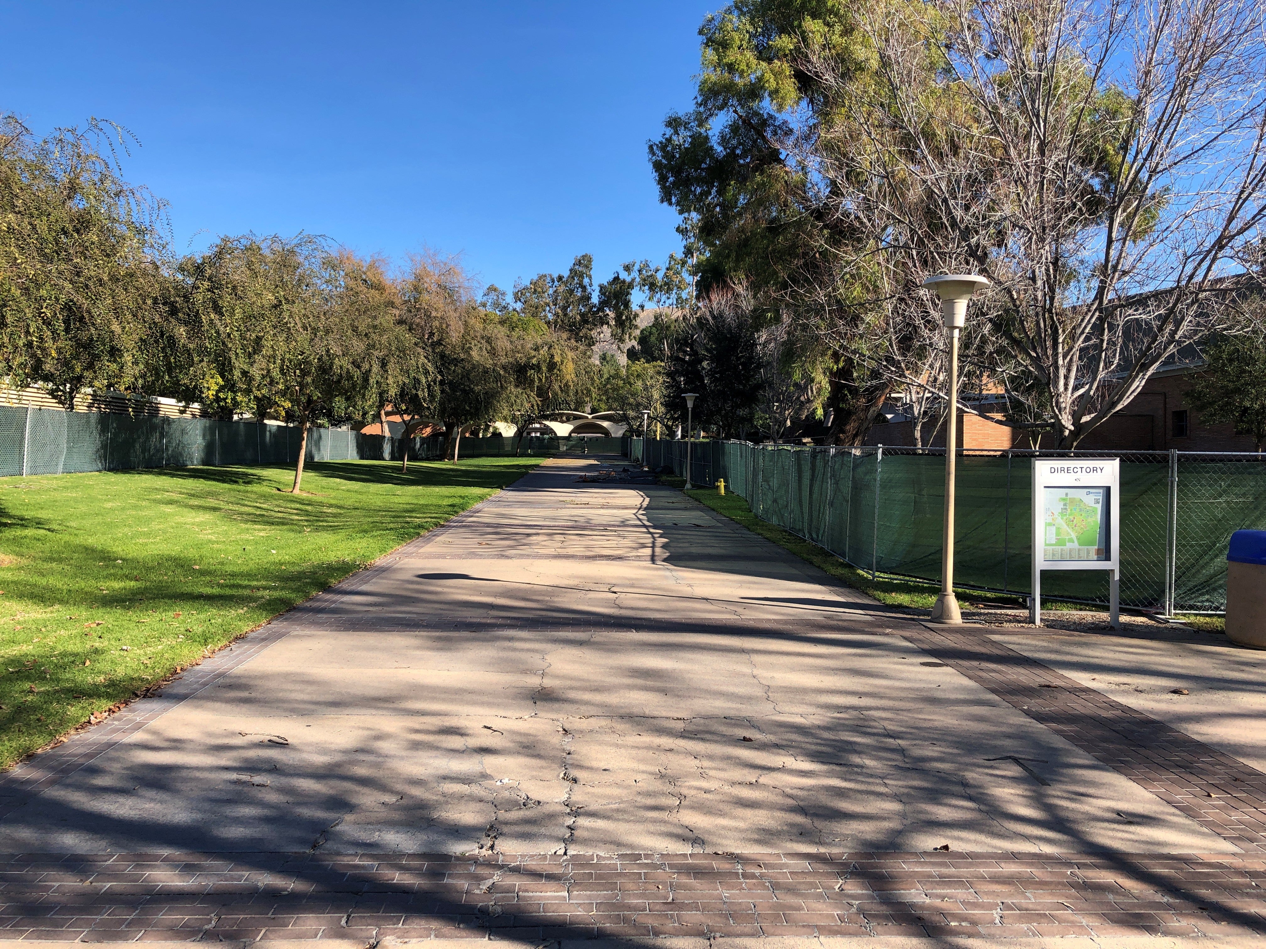 A UC Riverside walking path between the Barn and Rivera Library will be closed for the early part of 2022 due to a walkway replacement and infrastructure tunnel repair project.