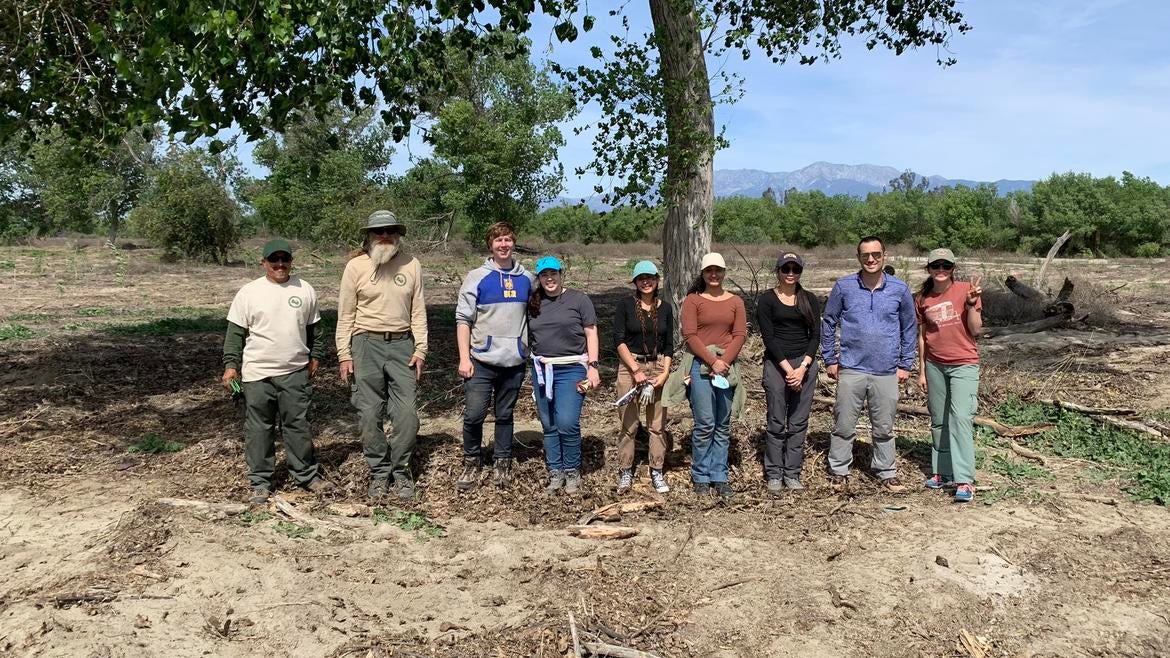Seven UC Riverside student volunteers from the College of Science and Natural Sciences, or CNAS, joined wildlife experts from the Riverside County Parks (or RivCoParks) in planting 240 native riparian trees at Hidden Valley Wildlife Area in Jurupa Valley, California.