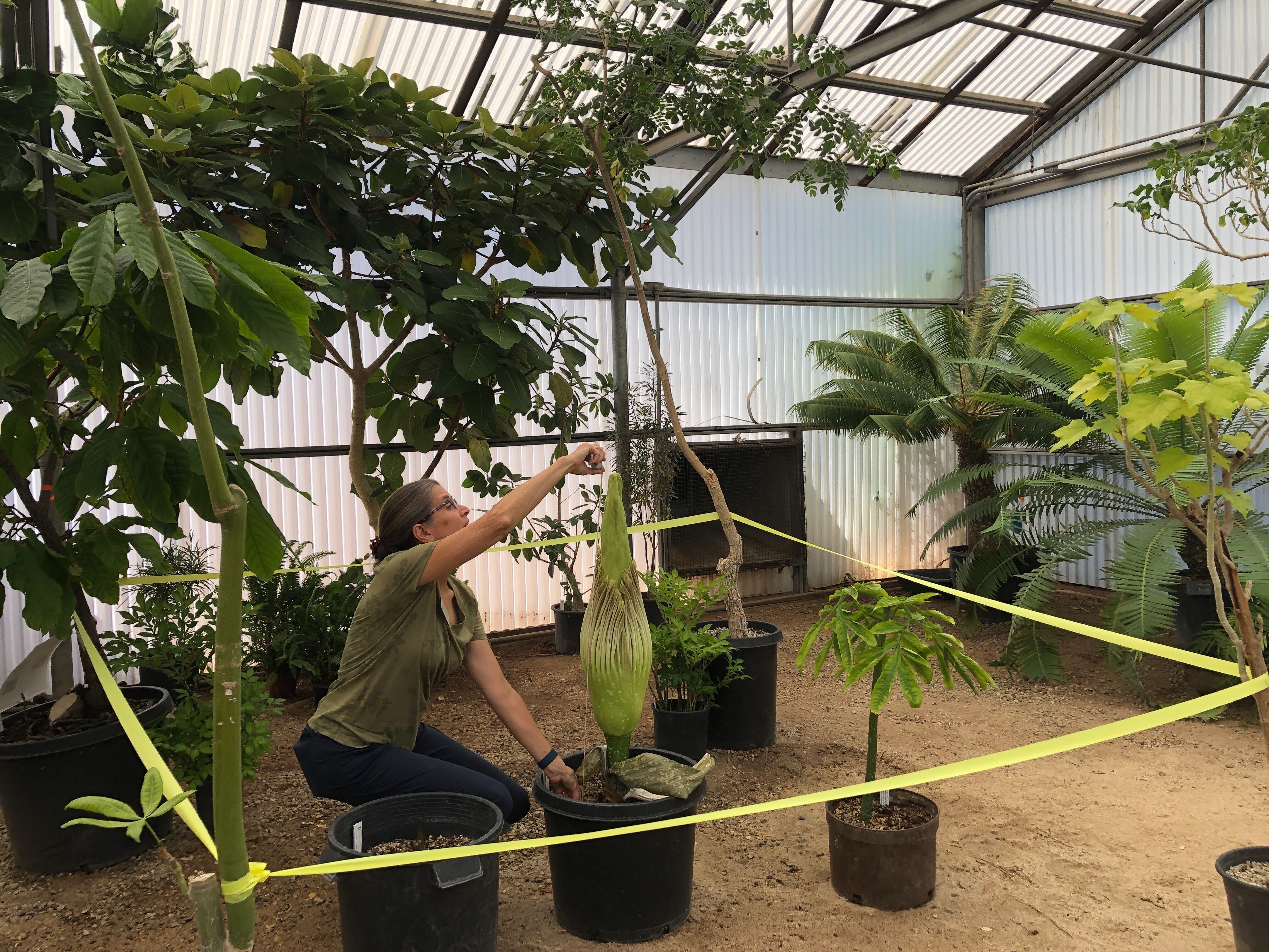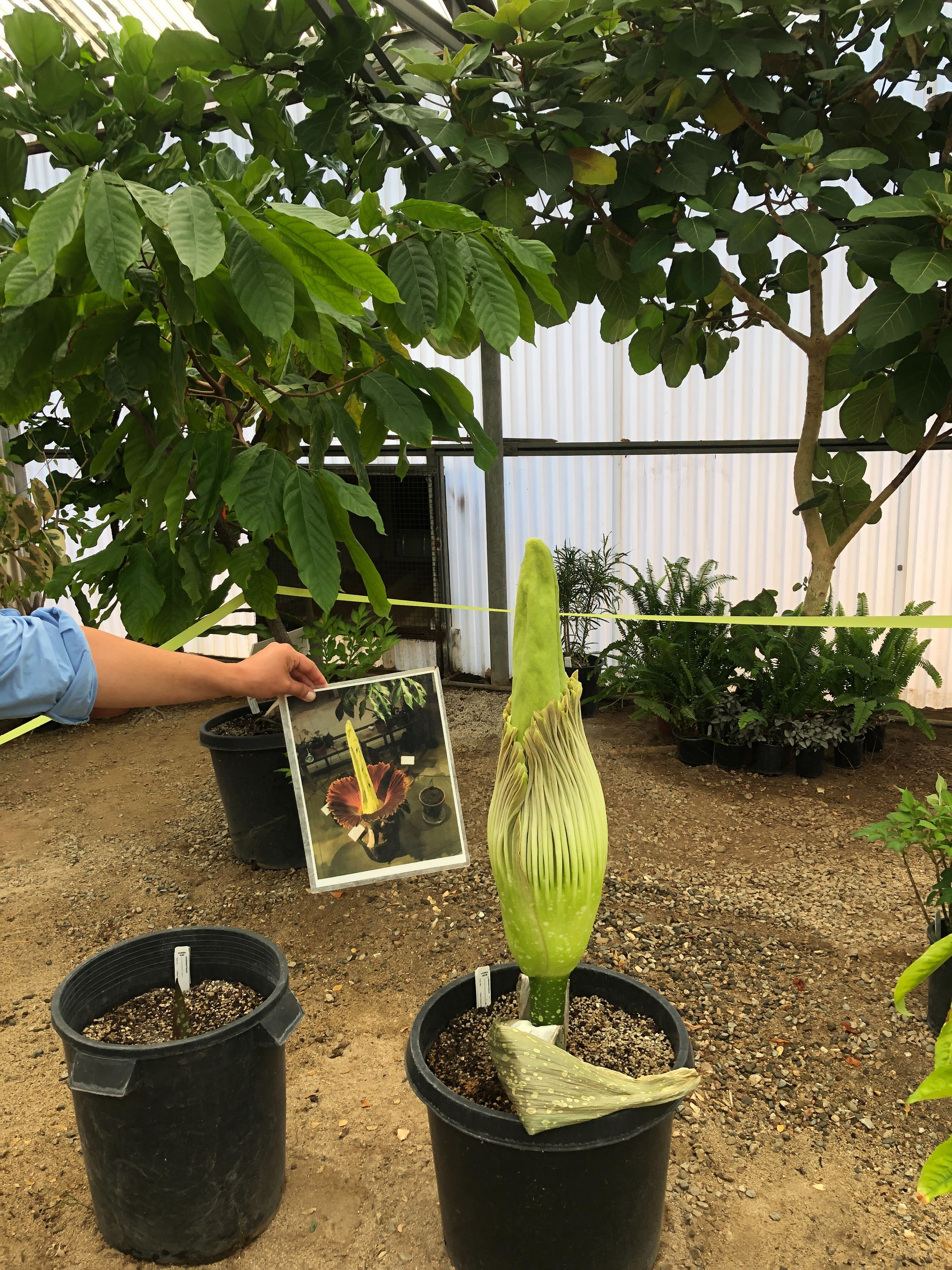 She and staff only realized that the plant was ready to bloom Friday, July 15, when they noticed the bracts, or protective modified leaves, folded around the growing shoot had cracked open and its thick inflorescence, or cluster of flowers, began to grow in height. Once that happens, the inflorescence typically blooms in seven to 10 days.