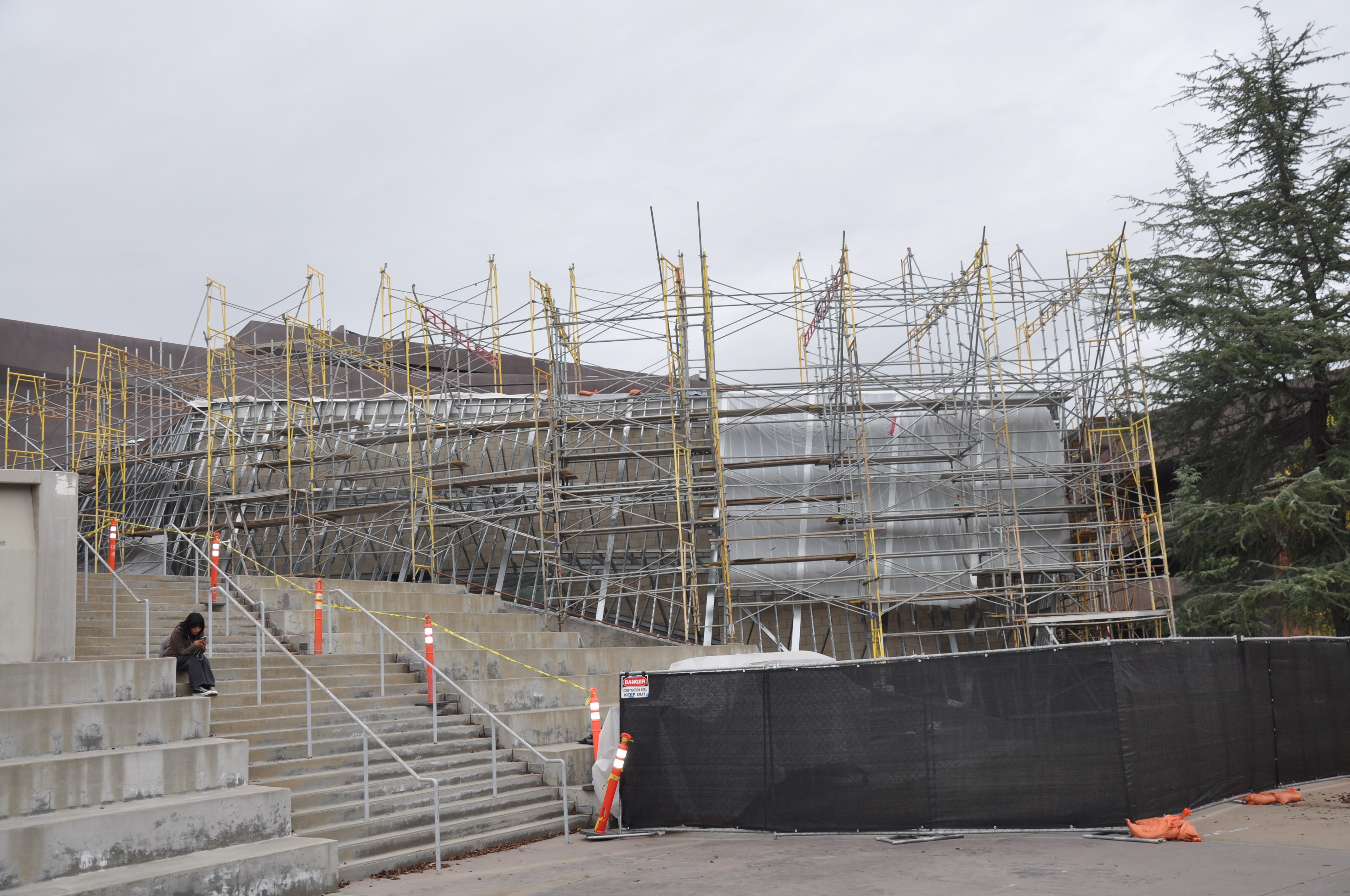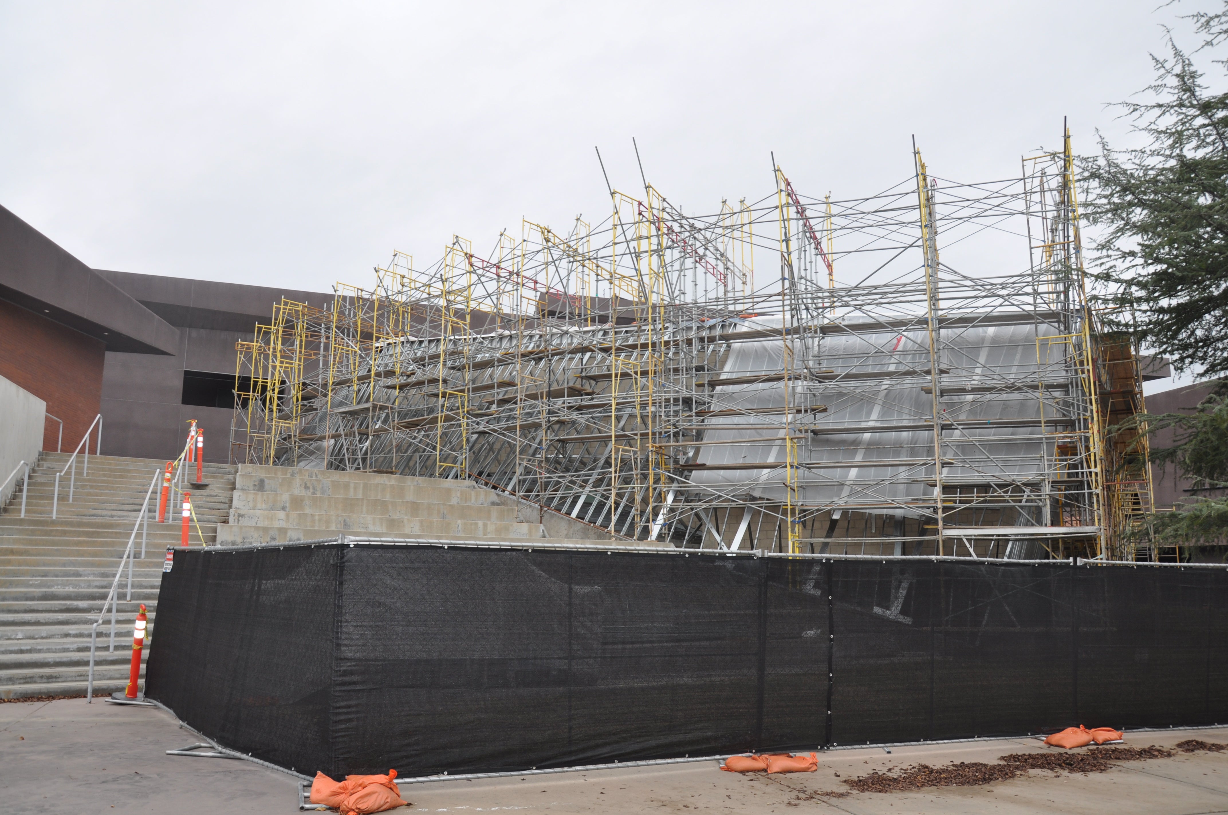 In early December, construction crews began work on repairs to the Performance Lab, which houses a theater in the center of the building and is next to the stairs that face out to the Arts Walk area.