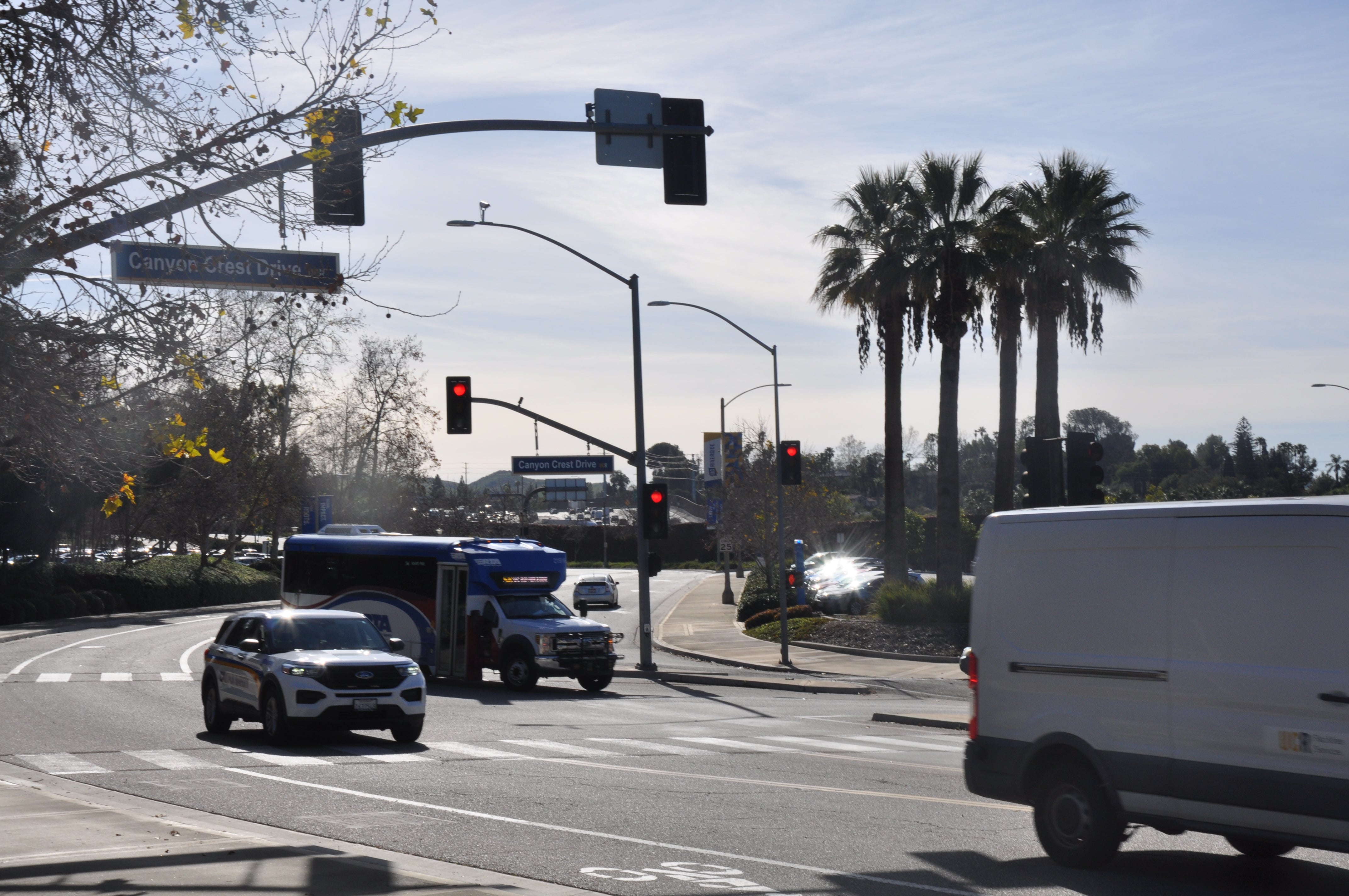 • Route 16, which comes from Moreno Valley and enters the south end of campus, along West Campus Drive to Bannockburn.