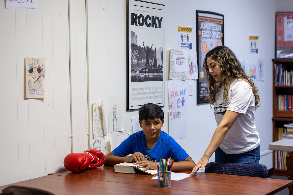 On a recent afternoon, Veliz greeted nine-year-old Samantha Fuentes and prepared multiplication tables for her to practice in a classroom area of the boxing academy. She checked on what books other students were reading, offering them suggestions.
