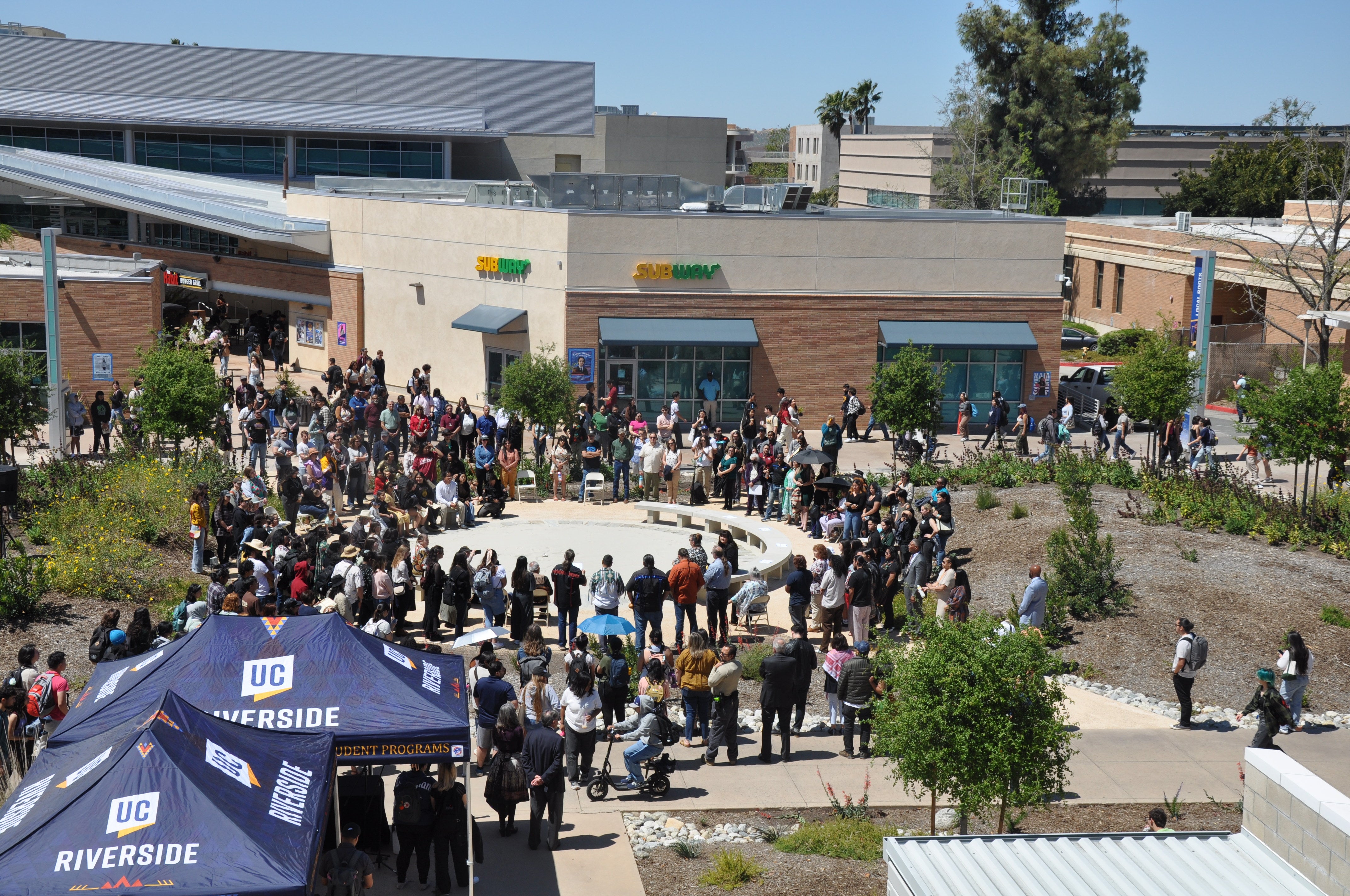 The 20,000-square-foot garden, located in the upper mall outside the Highlander Union Building, features a variety of trees, plants, and vegetation native to the region and its tribes – the Cahuilla, Tongva, Luiseño, and Serrano peoples. The project was planned with a working group that included campus leadership, students, staff, faculty, and Indigenous community representatives.