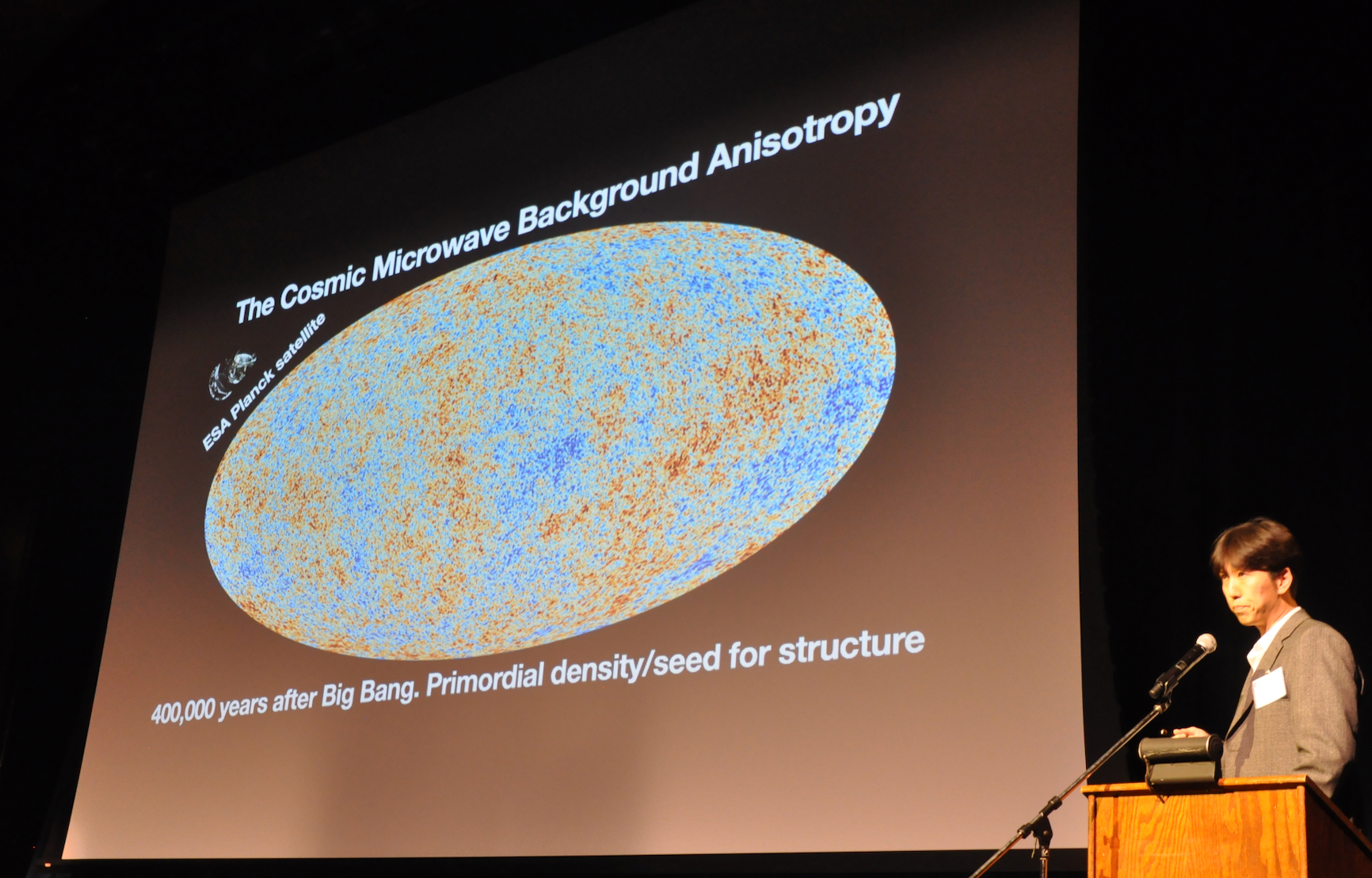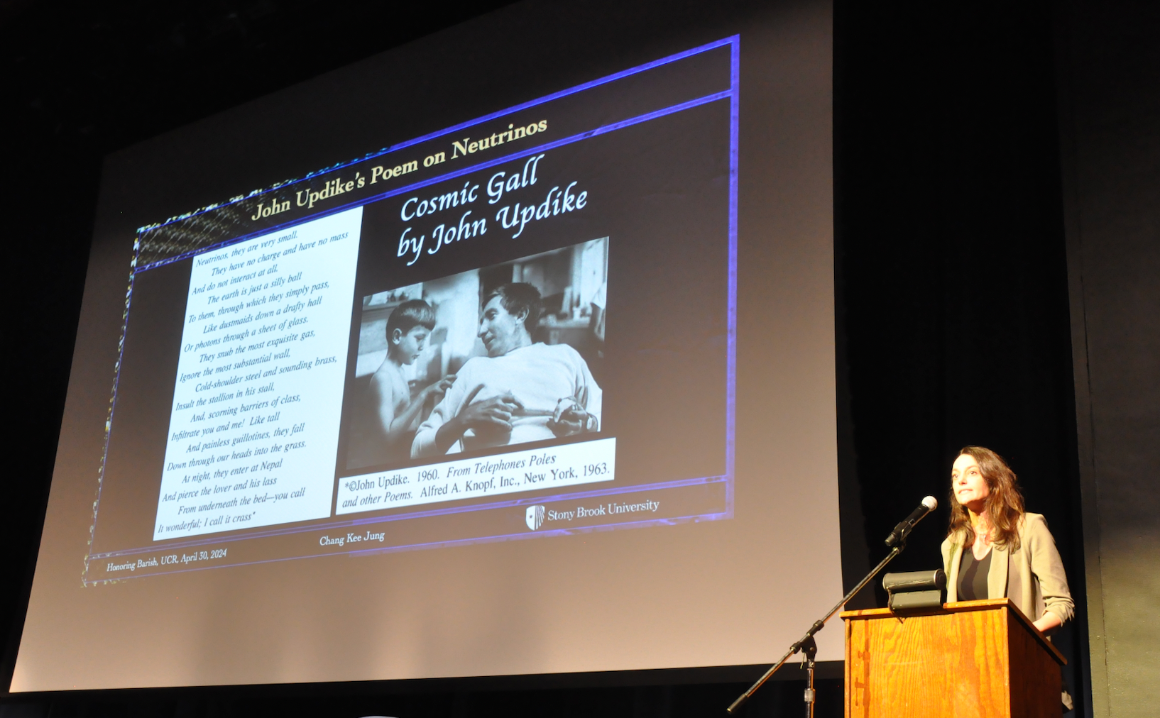 McDonald’s talk was followed by a presentation by Chang Kee Jung, a distinguished professor at Stony Brook University in New York, where he is chair of the Department of Physics and Astronomy. Jung mentioned he had the privilege to get to know three giants in particle physics, Barish being one of them. He invited Annika Speer, a professor of teaching, theatre, film, and digital production at UCR, to read “Cosmic Gall,” a poem on neutrinos by John Updike. Neutrinos, which are among the most abundant subatomic particles in the universe, are uncharged and barely interact with anything else.