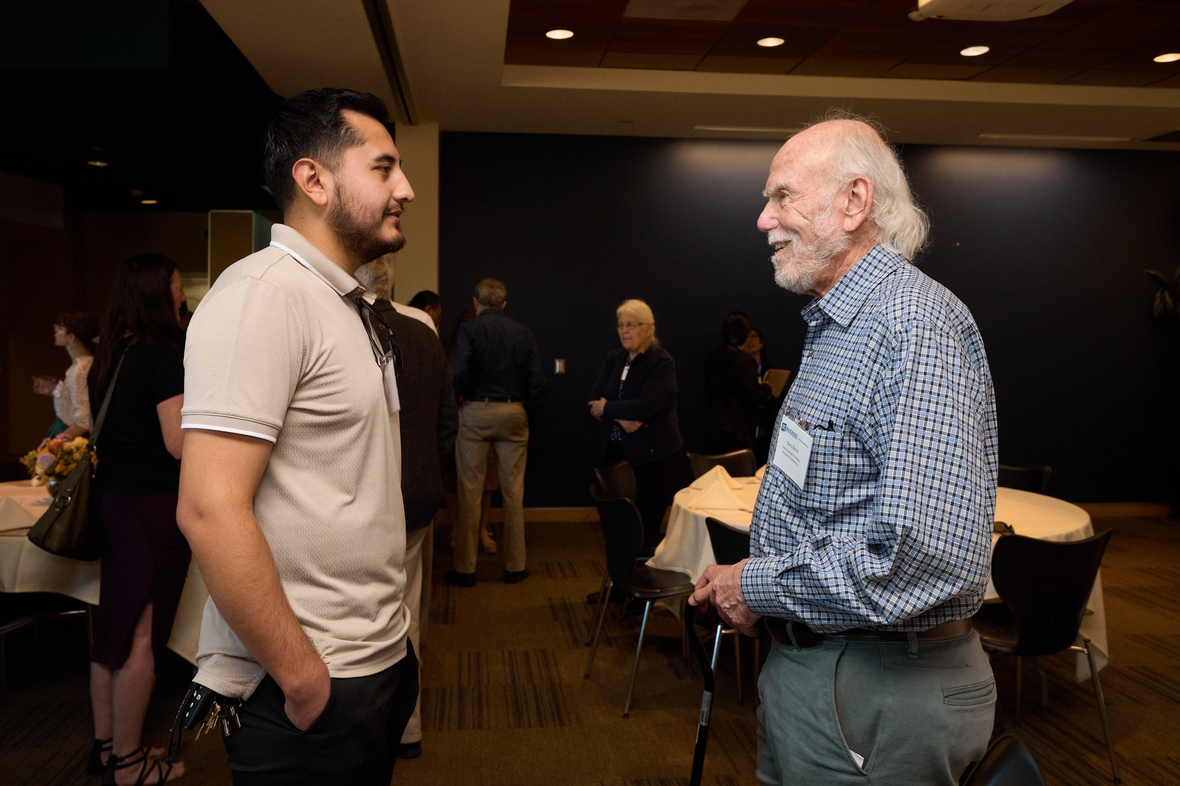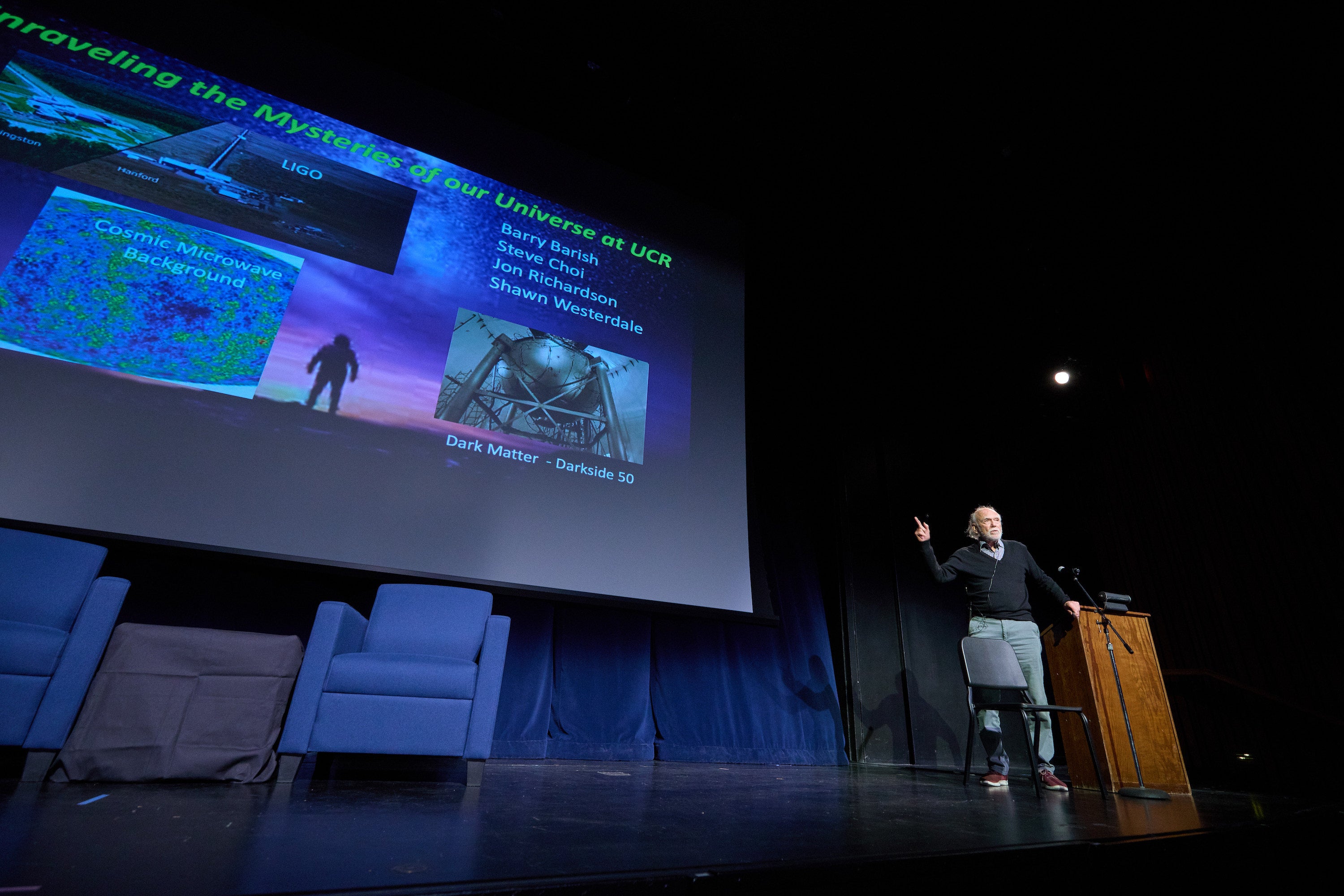 The evening program included a reception and a public talk, titled “Gravitational Waves: Unraveling the Mysteries of Our Universe,” by Barish at the University Theatre. Peter Atkinson, the interim dean of CNAS, and Kim Wilcox, chancellor of UCR, welcomed the audience. Kenneth Barish, a professor of physics and astronomy at UCR, introduced Barry Barish, his father.
