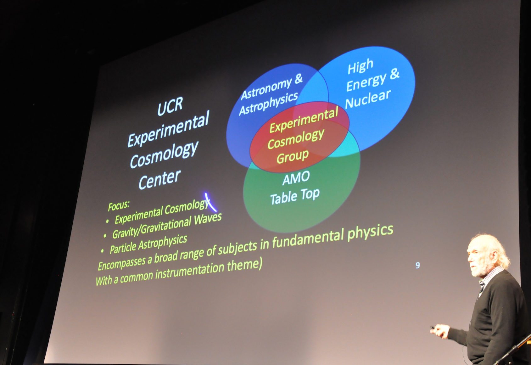 Barish discussed the new Experimental Cosmology Center that will encompass a broad range of subjects in fundamental physics, with a focus on experimental cosmology, gravity/gravitational waves, and particle astrophysics. He said there was a need to create such a center at UCR, a Hispanic Serving Institution.