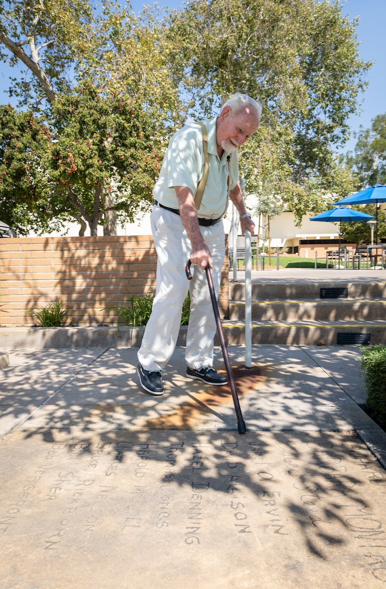 Ervin laughed as he recalled names and stories from that first class which included Chuck Young, the class president who went on to become a UCLA chancellor. Ervin was busy working the day students decided to carve their names in wet cement but classmate Doug Mumma wrote his name in for him. Originally located outside the gymnasium, the slabs are now at the HUB Plaza, where Ervin’s name can still be seen.