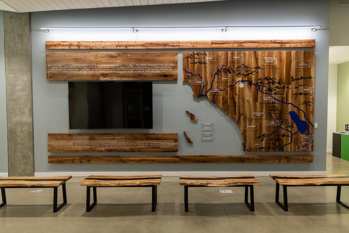 One of the most prominent elements of the display is a map made up of wood planks that lists tribes with their names on acrylic panels placed over their historic territory. The map covers a large area from the Chumash in Ventura County to the Kumeyaay in San Diego County to tribes from what is now the Catalina Islands.