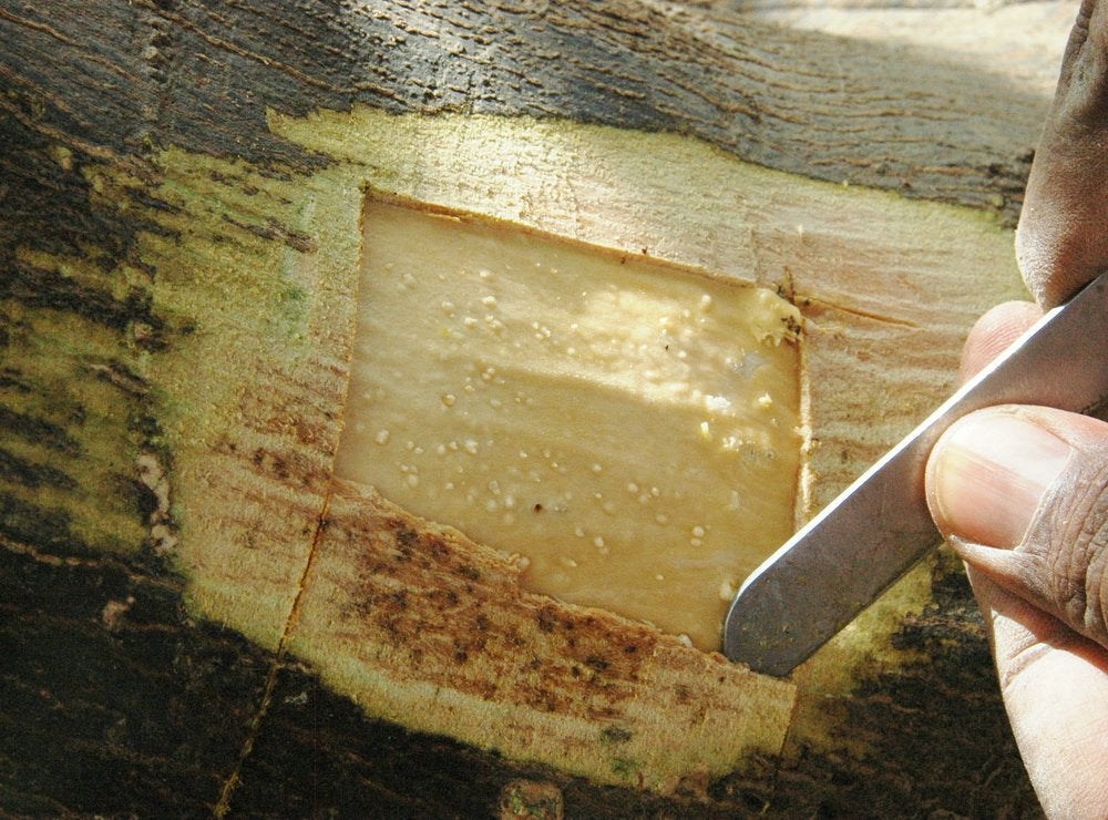 Strip of bark removed from the tree of KD. 02. Note the presence of gum deposits. (Government nursery, Kitiab, Sudan) – N. Duran-Vila
