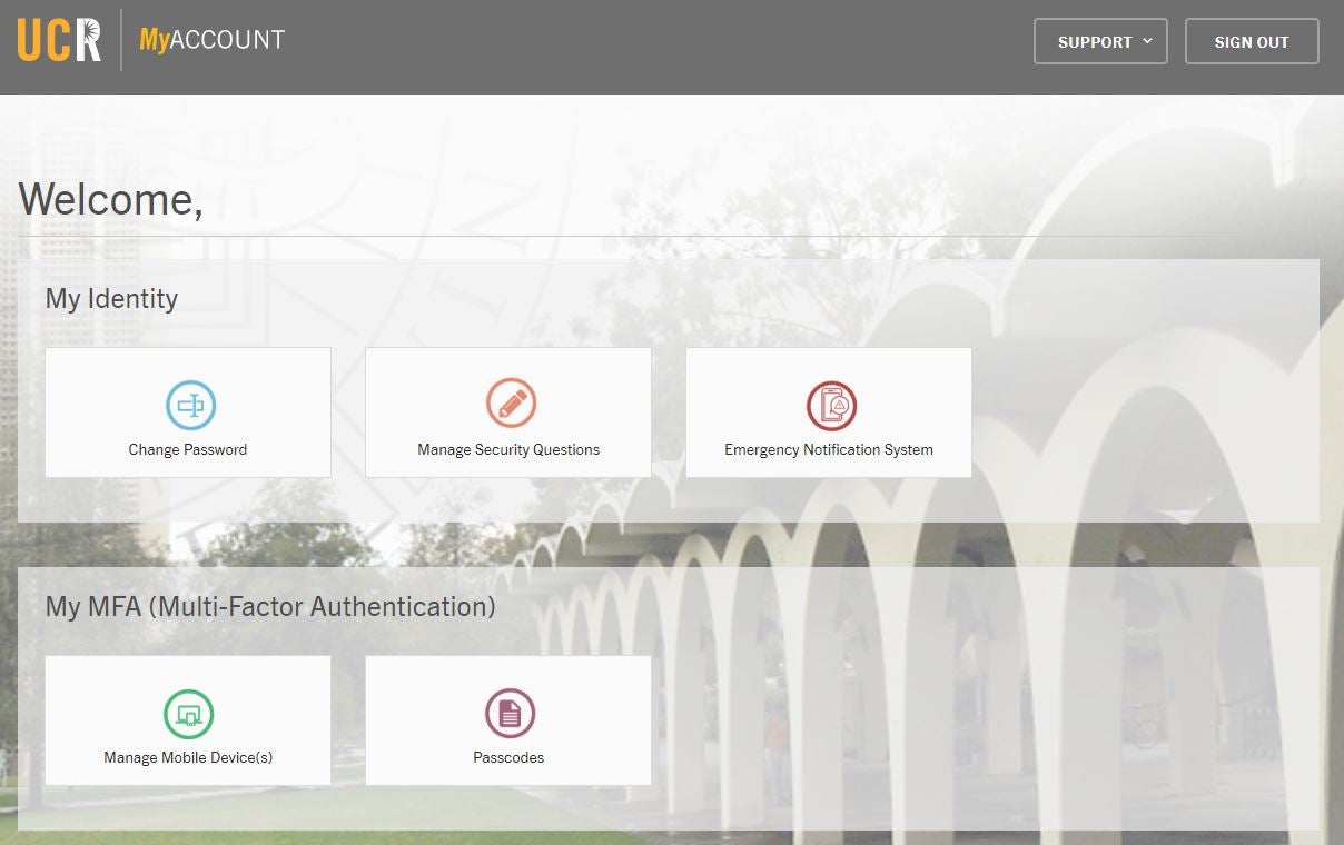 Upon entering credentials into CAS for the first time, new users will be prompted to enroll in multi-factor authentication (MFA) and directed to myaccount.ucr.edu. They will then need to select the “Enroll in MFA” card and complete the prompts to add a mobile device or select the “Download or Email Passcodes” card to complete enrollment in MFA.