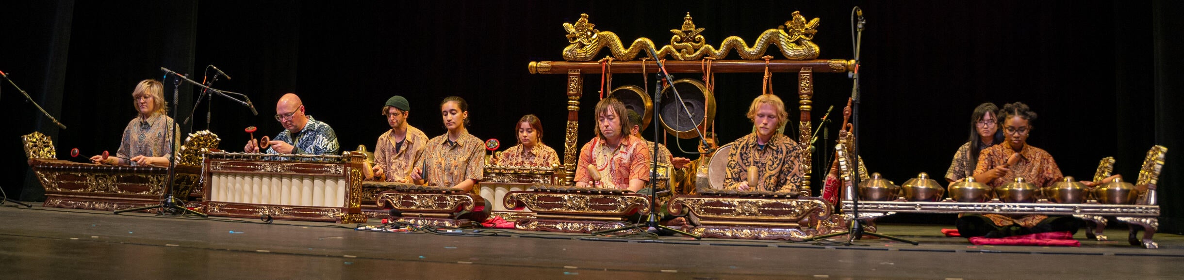 Gamelan instruments serve one of three musical functions: those that provide the time structure, those that state the melody, and those that elaborate upon the melody. A gamelan varies from eight to over twenty-five instruments and players, depending on the occasion and setting. The chiming, bell-like sound texture is like no other and is notably identifiable with Indonesia. Some repertoire played by today’s groups is traditional, but gamelan is not a museum tradition; contemporary composers continually supply new repertoire, integrating influences from sources worldwide.