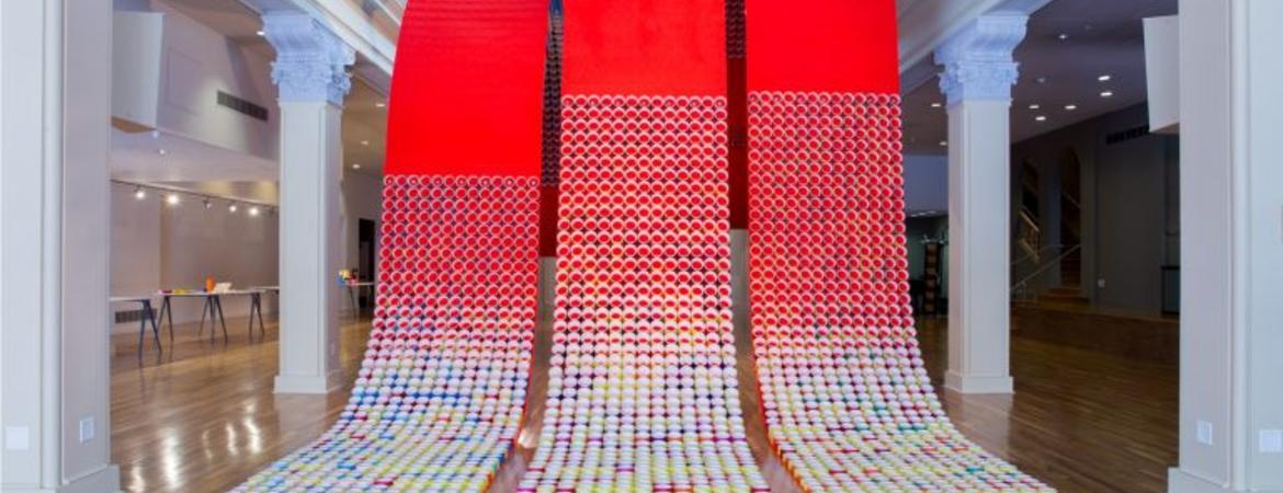 “Red Carpet in C” is comprised of three, 150-foot bands of opulent red cloth, populated with 17,000 colored cardboard tubes, suspended and flowing through the two-story atrium, and extending itself into low-hanging curvatures. Altogether, a pixel-like rhythm of color and space creates dynamic energy within the classical qualities of the symmetrically designed atrium.