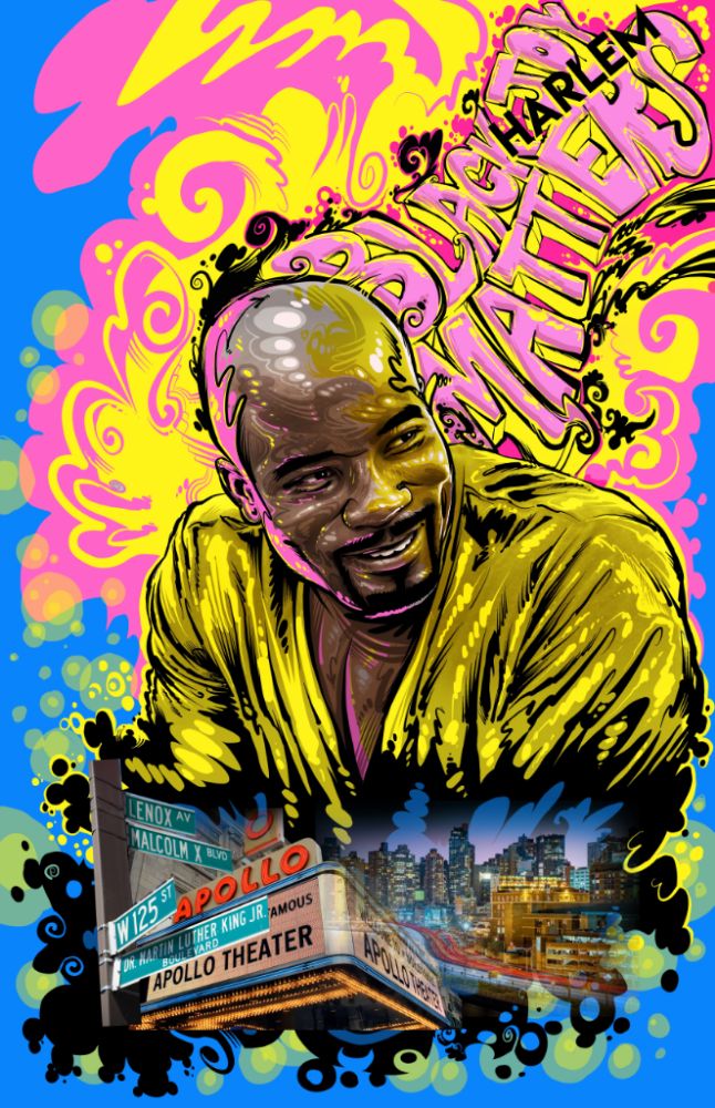 “Uncaged” delves into many of these stereotypes and the ways in which Luke Cage can be used to examine broader ideas surrounding black respectability politics and the self-policing of black communities to adhere to mainstream social values, black patriarchy, the prison-industrial complex, gentrification and cultural appropriation, the history of experimentation on black Americans known as medical apartheid, and black fatherhood. Through the use of digital mixed media, Black Kirby seeks to unpack the character and his “indestructible” body as an index for the black experience of America.