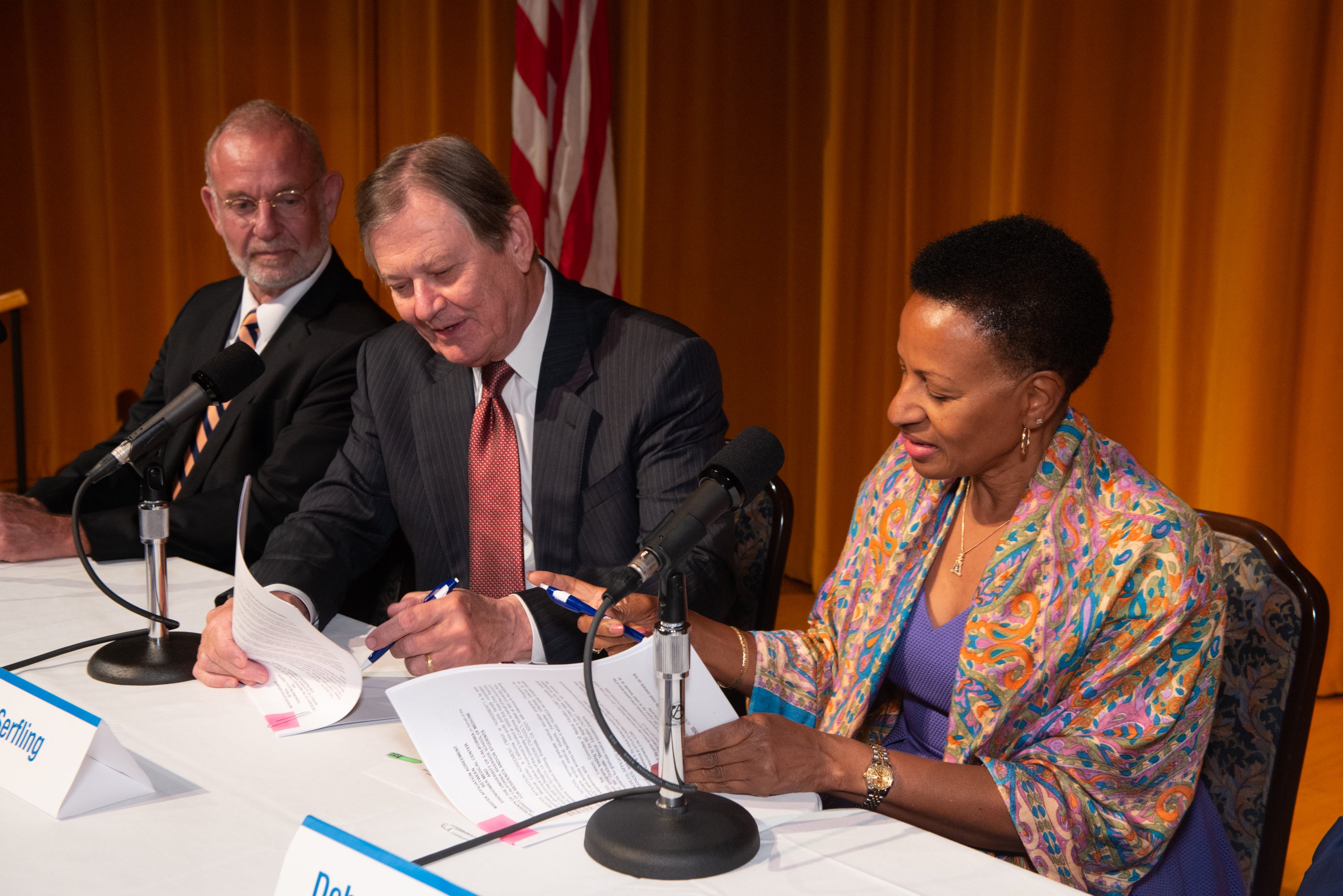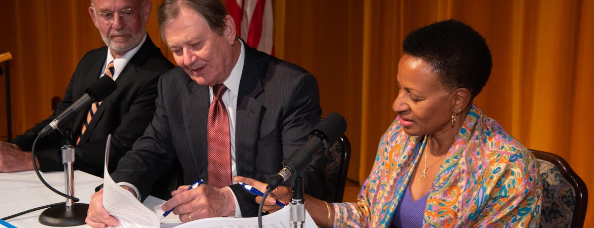 Deborah Deas, the Mark and Pam Rubin Dean of the UCR medical school and chief executive officer of clinical affairs, and G. Aubrey Serfling, president and chief executive officer of Eisenhower Health, signed the affiliation agreement in an informal ceremony attended by leadership, faculty, and staff of both institutions in the Annenberg Health Sciences Building on the Eisenhower Health campus.