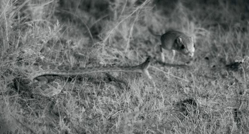 Kangaroo rat dodges rattlesnake strike.