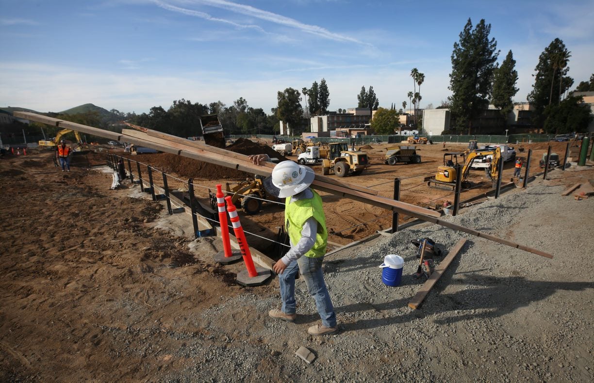 On a sunny morning at the north end of UC Riverside, bulldozers and dump trucks are busily grading dirt while construction crews put together a frame foundation for the campus’ newest housing and dining complex.