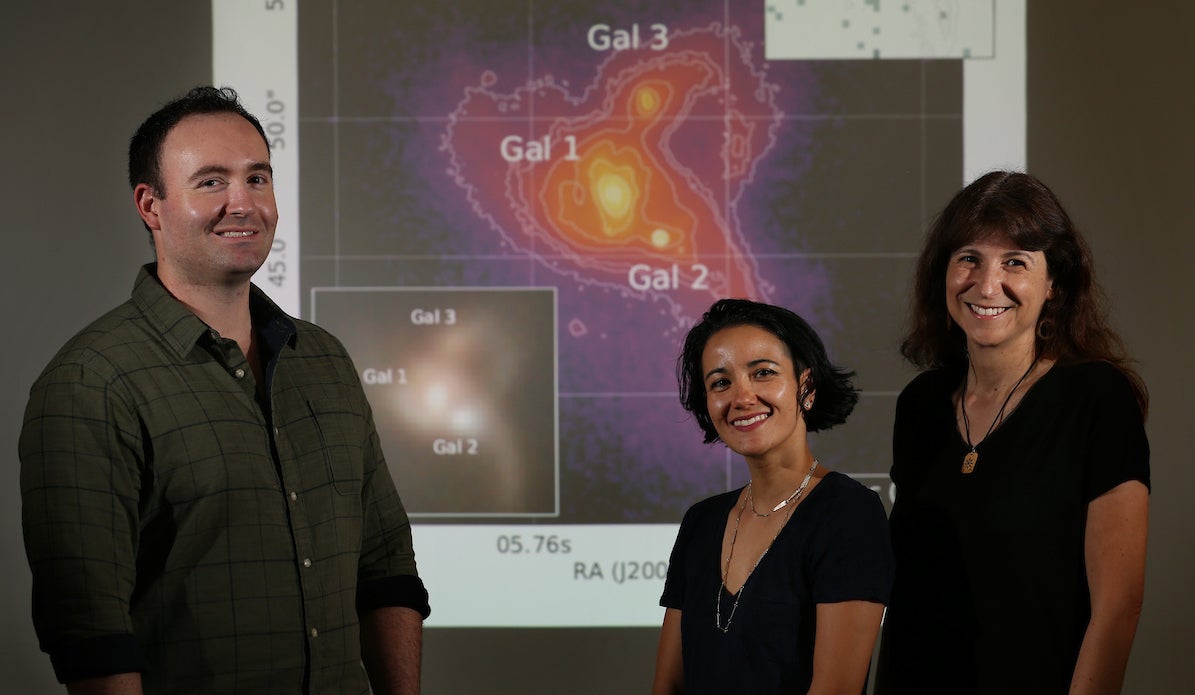 Canalizo explained that triple merging active galactic nuclei, or AGN, are interesting because they provide a way for supermassive black holes to merge more easily: One of the black holes can take away some of the energy from the system, so that the other two can “sink” into each other.
