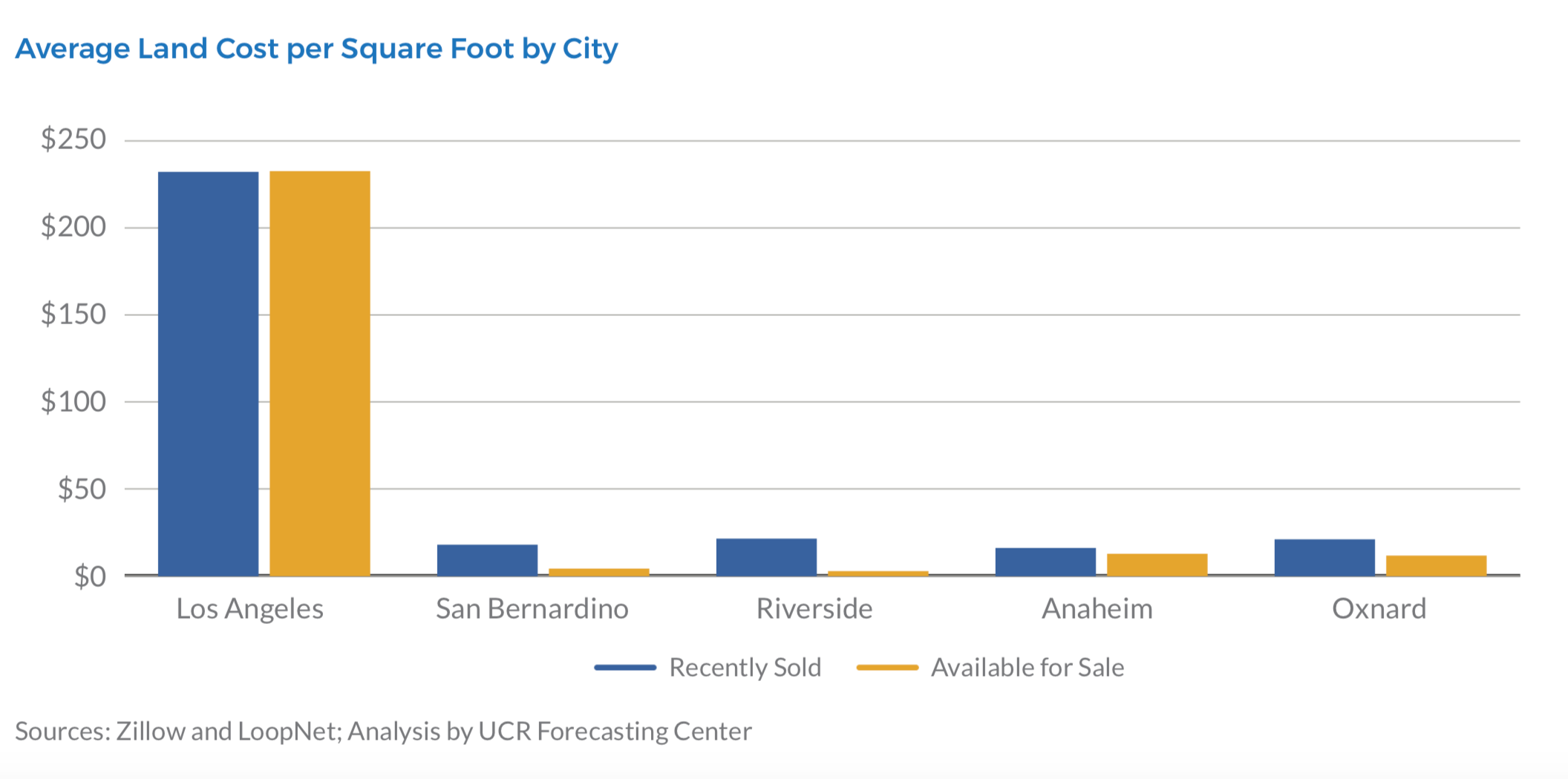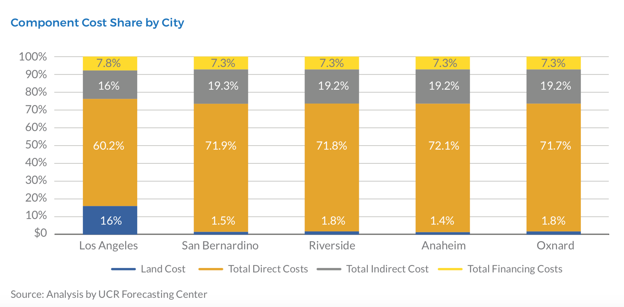 According to the analysis, in Los Angeles, land costs account for nearly one-sixth of a multifamily project’s total development cost compared to less than 2% in other Southern California cities studied (the cities of Anaheim, Oxnard, San Bernardino, and Riverside were used alongside Los Angeles in the prototype analysis).