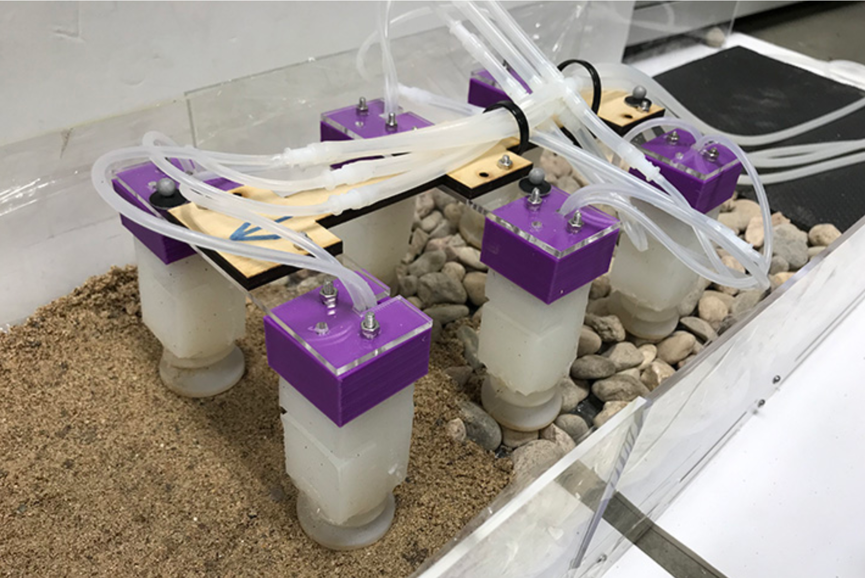 SoRX, a novel soft-legged robot that can cross terrains consisting of sand and rocks. (ARCS Lab at UCR)