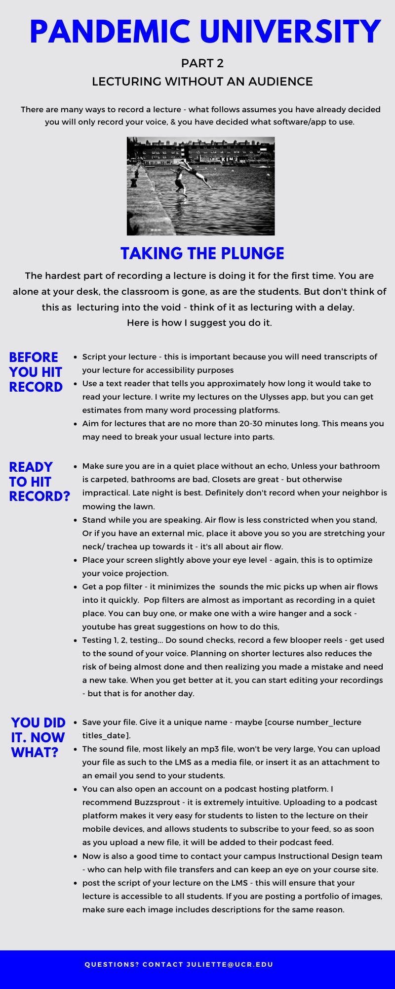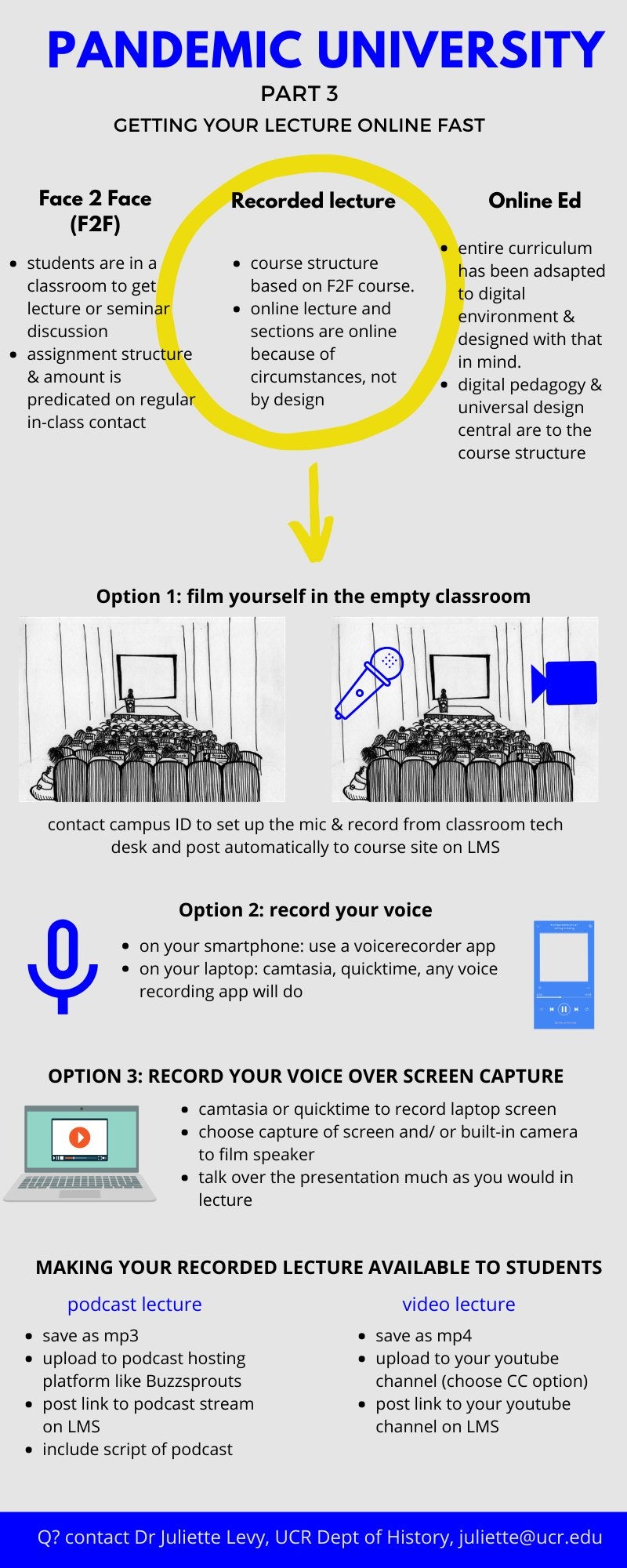 What about practical recommendations for those who are teaching online for the first time? My recommendation would be to create podcasts and upload them to an external hosting system, or do videos and upload them to YouTube, then link to those on our campus learning management system, or LMS; otherwise, my fear is the LMS will be completely overloaded. I’d urge people to record their voice and provide a portfolio of the images or slides that they’d normally talk over in a lecture. There are a few reasons why; first, an audio file is much ‘lighter’ to upload and easier to access on a mobile device. More students have access to a smartphone than a laptop, and more families have multiple smartphones as opposed to multiple computers or laptops.