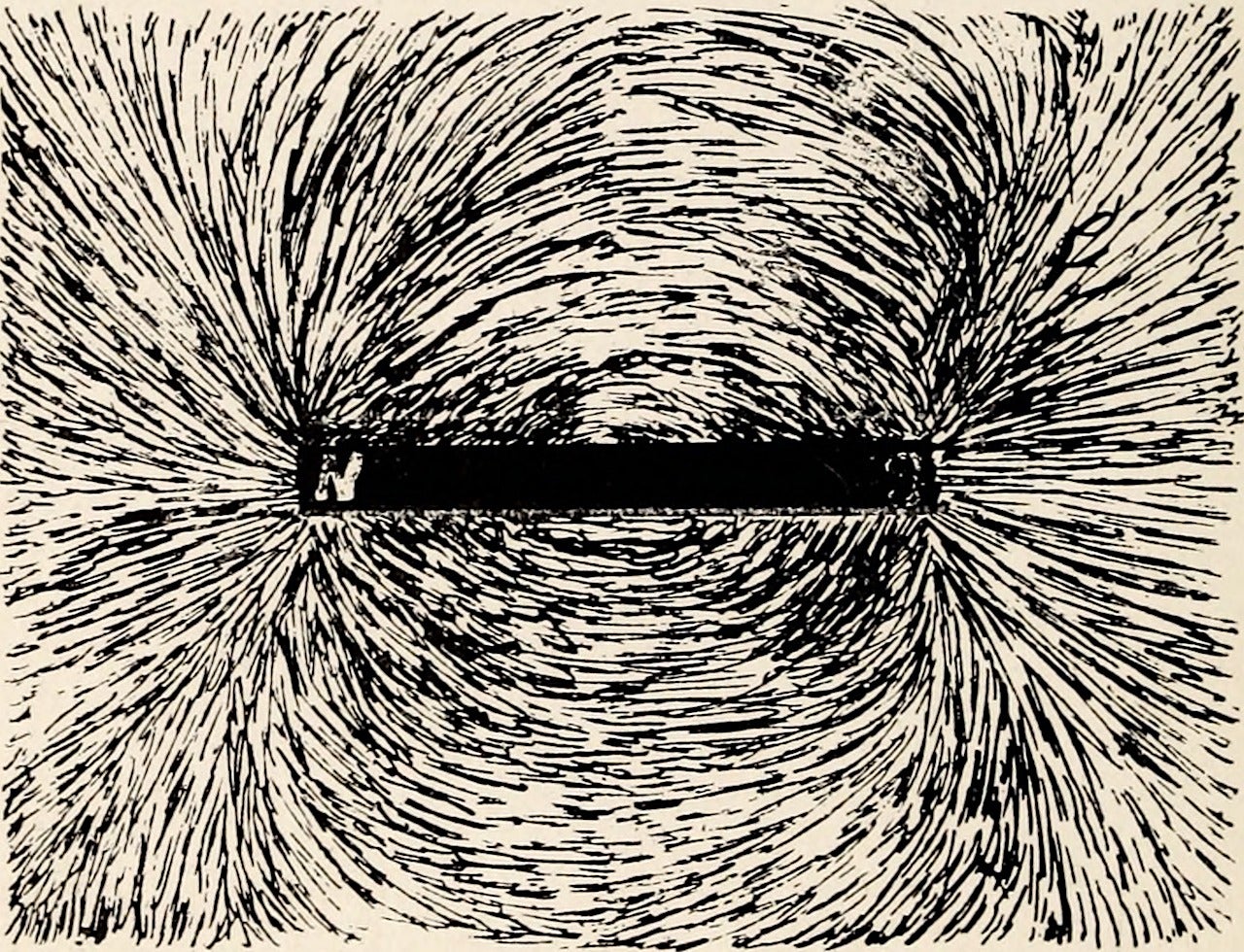 Header photo: Iron filings aligned with the magnetic fields between the poles of a magnet. (Wikimedia Commons)