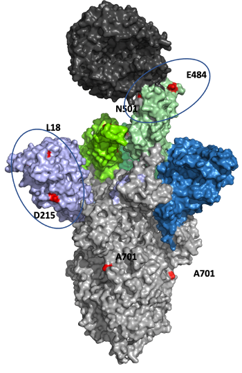 Positions of the mutations identified in the new SA variant shown in red on the structure of the SARS-CoV-2 spike protein (PDB: 7a94). N-terminal domain and receptor binding domain of the spike are shown in shades of blue and green respectively. The remaining part of the spike protein and human ACE2 receptor are in grey and black, respectively. (UCR/Godzik lab)
