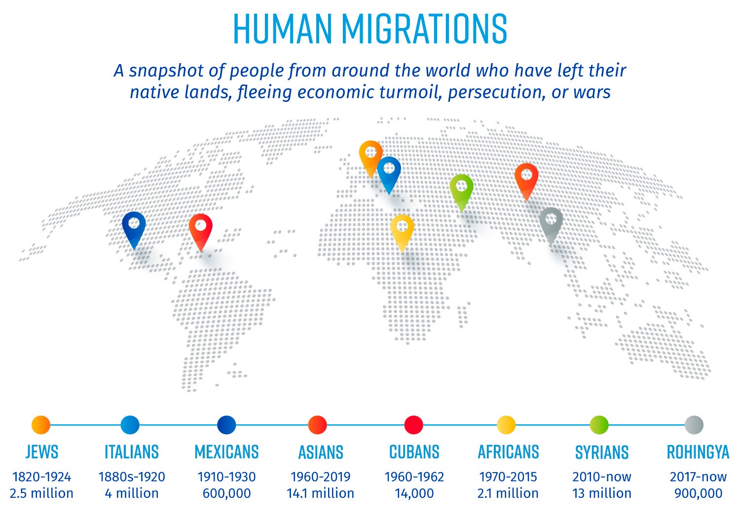 The world’s history has been marked by human migrations — and continues to do so. Here is a chronological snapshot of people from around the world who have left their native lands, fleeing economic turmoil, persecution, or wars.